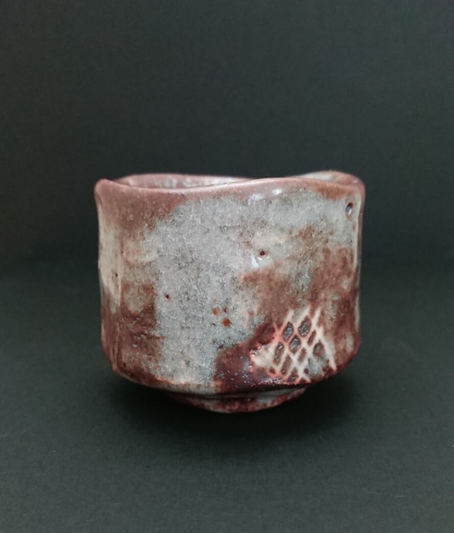 〈解説〉山田さんの作品はその力量の割にあまり世に出ていない。これまで、広島の天満屋で定期的に個展をする他に、名古屋の松坂屋で今年二度目の個展をしたくらい。ただ、天満屋では好評を博して、毎年会場が増えて、今年は福山や米子で個展が開かれるらしい。松坂屋でも再来年の開催が決まったそうで、いざ作品に接すれば、評判は上々のようだ。ようやく世間もこの方の面白さを認め出している。本作は、山田さんにしては珍しい鼠志野。鼠色とも、青とも、赤とも、白ともみえる変幻自在な色彩は、志野のネガ版ともいえるこのやきものの定番の魅力。それ以上に目を引くのがその形式。いっけんモダンみえるが、実は桃山志野の基礎的な諸法則をうまく組み合わせたにすぎない。高台から腰にかけてのたおやかなライン、しっかり張った腰、腰から上に向けてすぼまっていく動き。腰のぐるりに施された面取り。この作品が十分にモダンにみえるのは桃山自体がモダンだったからといっていい。そのことを十分に意識する作家は、それに忠実であることが新しさの追求につながることを知っている。この作の素朴にモダンな風貌は、それを的確に物語っている。