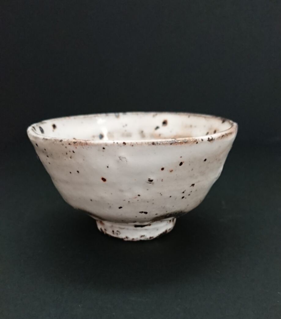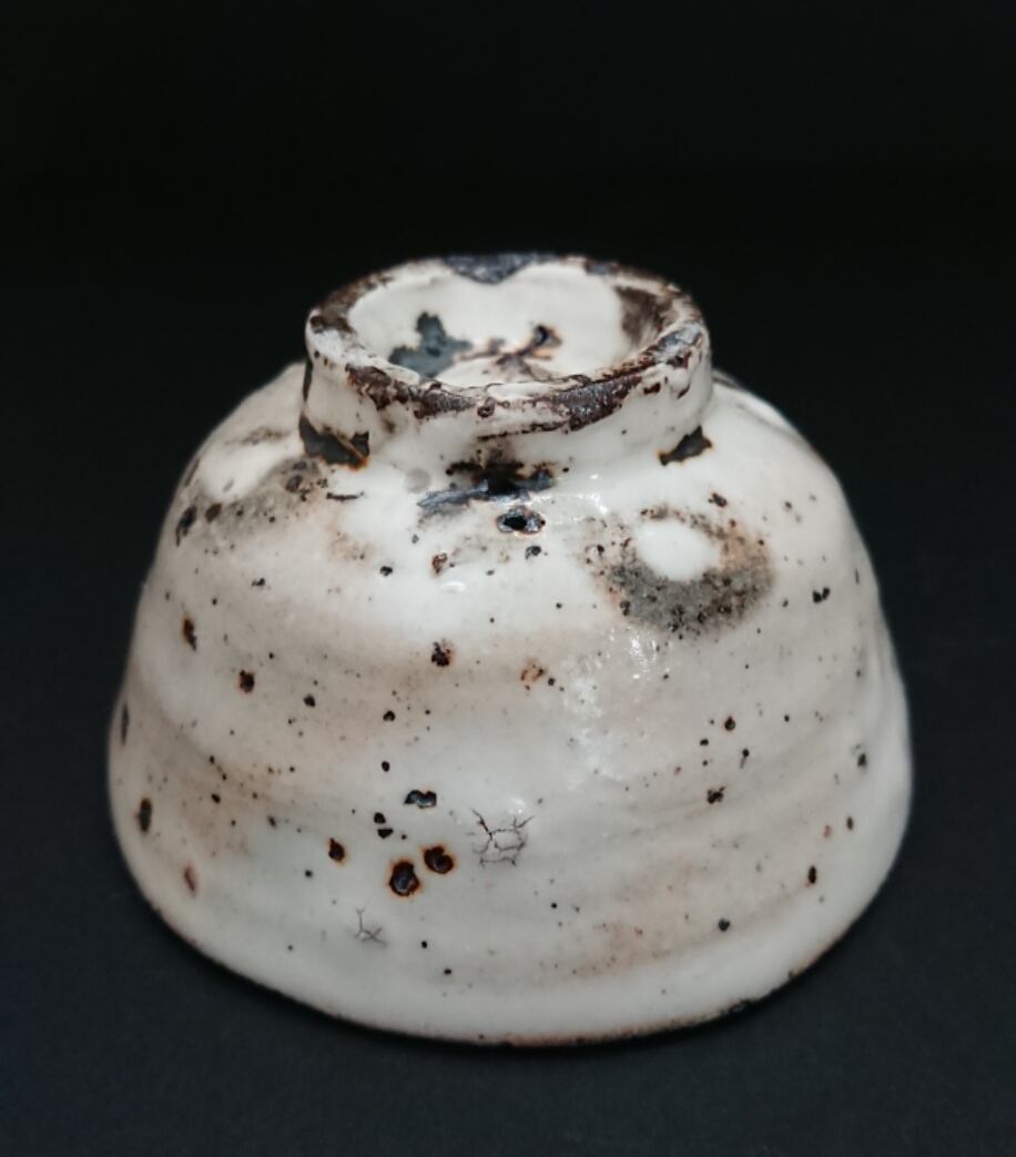 《解説》粉引を始めたきっかけは、深見さんが最近つくりだした赤漫粉引にあるという。粉引のうえに赤絵で漫画を描くという漫画織部の新作である。赤絵が引き立つ生地にしないといけないので、できるだけ白い地を目指した結果、面白い無地粉引(?)ができた。絵がなくてもこれだけで十分面白いのではと作品化したのが本作である。このプラスティックのような質感の白、そこに不自然に現れる大きな鉄粉や石ハゼが特異である。粉引は一般受けするので、それらしい体裁のものが巷にあふれているが、だからこそ、これという作品にめぐり会える機会は少ない。そんななかで深見さんのこの粉引はまさに異形のという形容がふさわしい。白泥や濃い鉄粉など、粉引に備わるとされる特徴が不自然なほど強調されて、まるで本歌の戯画をみているようで。雨漏り風の濃淡やピンクがかった御本もうれしい。右から左にとおり抜けていく凡庸な粉引が氾濫するなかで、どこか引っかかりを感じさせるこの作品は確かな声をもっている。