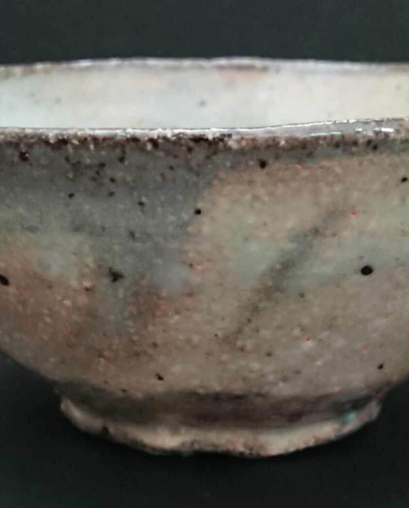《解説》一昨年の暮れに、ショップへの御協力をお願いに工房にお邪魔した際、「これどうですか?いいでしょ。」とみせて頂いたのが青っぽい茶碗だった。「いいですねえ。でもこれは何ですか?」。青磁っぽいけど青磁ではないし、かといって他の古作でこんな青い茶碗みたことないし。「粉青ですよ。粉引に青磁釉をかけてるんです」。三島や粉引などを総称して粉青というが、その釉薬は透明で、焼きによってときに青みや赤みがでる程度。そこに杉本師は敢えて青磁釉をかけて文字通りの粉青沙器をつくった。その後、本ショップへの出品作として、それをぐい呑みで御用意下さった。その時に拝見した御作よりもはるかに進化したその姿に驚いた。それは、白泥も青磁釉も一様でなくムラムラした景色をなし、青磁とも粉引とも違う世界を表現していた。確かに「粉青」としかいいようのないものだ。さらに注目はその造形。大きめの高台は下品になりがちだが、腰から口縁に向いて上がっていくたおやかなラインのおかげで品格を保つ。形式への厳密な視点をもつ師の真骨頂ともいえる。