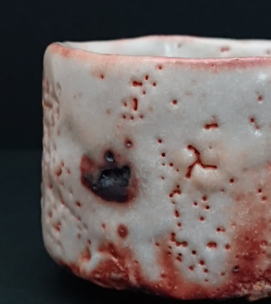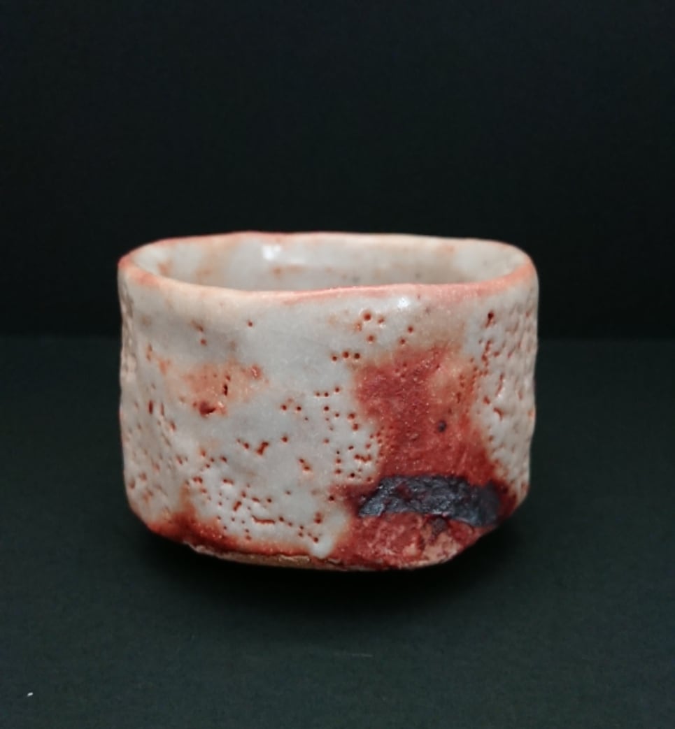 《解説》「ぐい呑み考」で一番最初に取り上げた山田さんのオレンジがかった志野はできないか、と以前から作家にお願いしていた。師匠の加藤康景氏ゆずりの独特の志野で、筆者がこの方の作品世界に引き込まれたきっかけとなった作品でもあった。作家がおっしゃるには、最近は当時と違う窯を使っていて、その窯ではあれは出ないのだそう。だが、手元にあるあのオレンジ志野をみるにつけ、おそらく、これを評価する同志は、筆者以外にもおおぜいいるにちがいないと確信する。で、何とかならないかと無理をいい続けていたら、今度の瀬戸黒シリーズでそれらしい作品が仕上がってきた。それがこの作品。全体に白の色調が勝っているが、ところどころにかかる火色は、まさにあのオレンジの明るい輝きを放っている。この作品では、厚くかけられた釉に現れたピンホールが、まるで梅花皮のようにひび割れていく様が魅力のひとつだが、これにそのオレンジがさすと全体の立体感が一気に増してみえる。瀬戸黒形式のなかで、作家の育んできた技が十全に生きた作品といっていい。