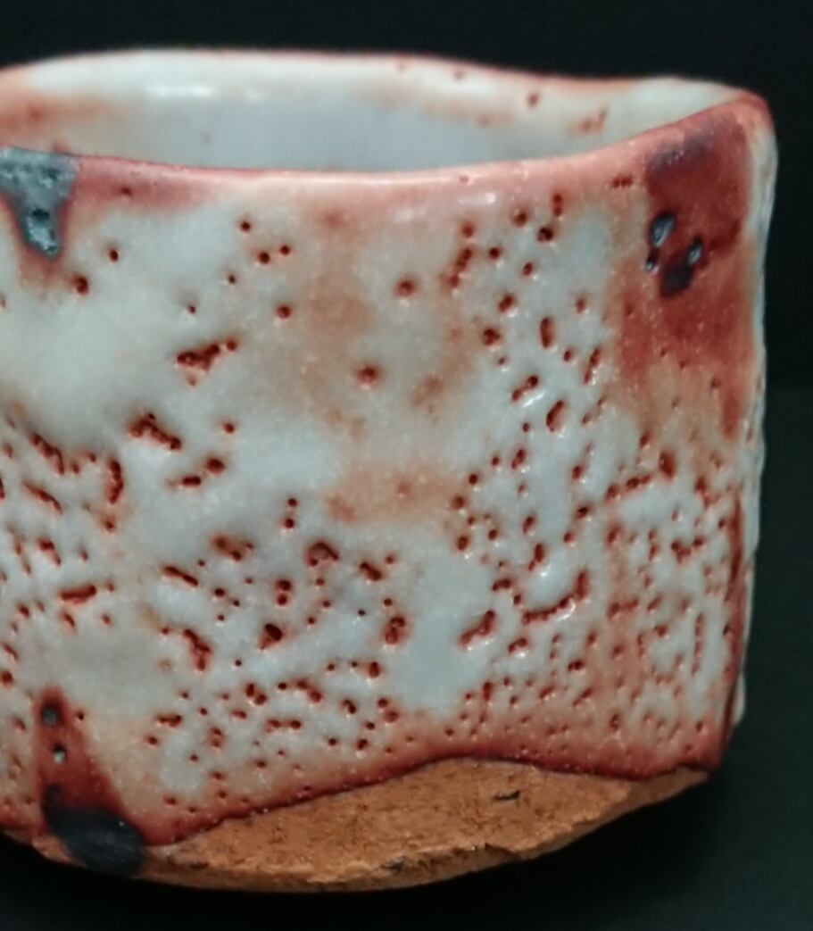 《解説》側面の四方からの写真をみるとよくわかるように、この作品においては、それぞれからみる角度で形も表情も大きく変わる。たいていの作品は正面が決まっていて、それは一度ぐるりをみれば、すぐわかる。だが、この作品では、それを何度繰り返しても、とうとうわからずじまい。逆にいうなら、どこからみても正面であることに耐えるコンバーシブルな作品であることを意味する。茶碗なら具合が悪いのだろうが、自由なぐい呑みであれば、それはむしろ利点にもなる。瀬戸黒の造形を意識しているが、高台から水平に伸びて垂直に立ち上がる腰のところの三角にみえる土見せ、指跡、ポツンと垂らされた鬼板が、それぞれの面においてアクセントになっている。異なる表情をみせる釉調も魅力だが、屹立する腰の釉際の表現もまたこの作品の見処のひとつ。見込みにムラムラっと広がる火色も美しい。