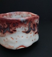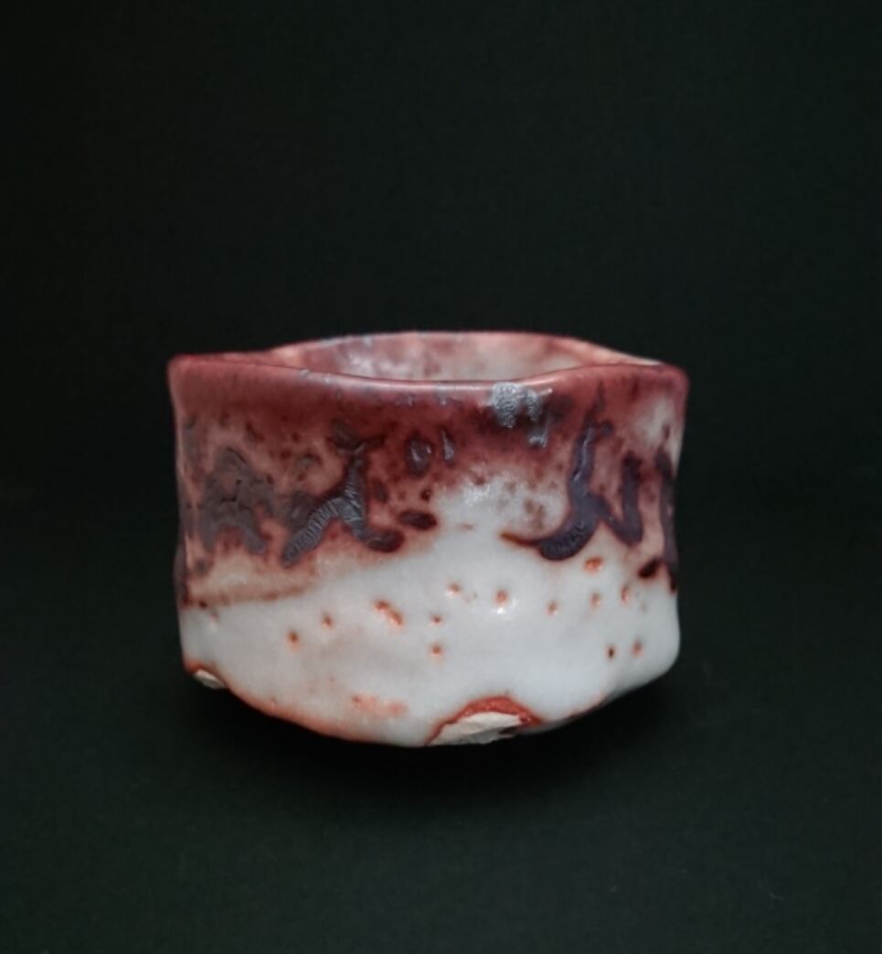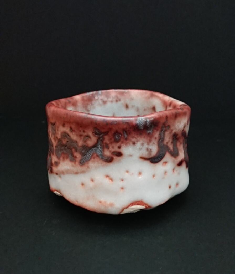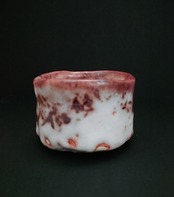 《解説》鼠志野というタイトルからして、はて、これが?、と思う方は少なくないはず。鼠志野は鼠色だからその名称がある。なのに、都さんのこの鼠は、鼠色からはほど遠く、むしろノーマルな志野よりはるかに白い。口縁の部分に鬼板が施されているところが、辛うじて、この作品を鼠志野にしている。作家はどんな意図でこんな発想をしたのか。この釉景色をみて自然と思いついたのが富士山。長石の真白な部分と鬼板の赤鼠の部分とで、暗雲垂れ込めた夕景に聳える白富士にもみえる。楽などの伝世品にもこの手のデザインは多い。都さんにそれを確かめると、全く的はずれ。作家の信奉する唐九郎の作品にこの手の茶碗があるそうだ。へー、そんなんつくってるんだ、と調べてみたら、あるある、同じような作品が。楽とか、仁清とか、唐九郎からはほど遠い印象だが、そんな作為でも、この天才にかかれば、たちまち唐九郎色になってしまう。あっぱれ、唐九郎!。でも、写真でみる限り、という条件つきで、都さんのこの鼠のほうが断然きれいでステキである。