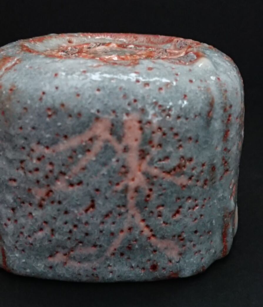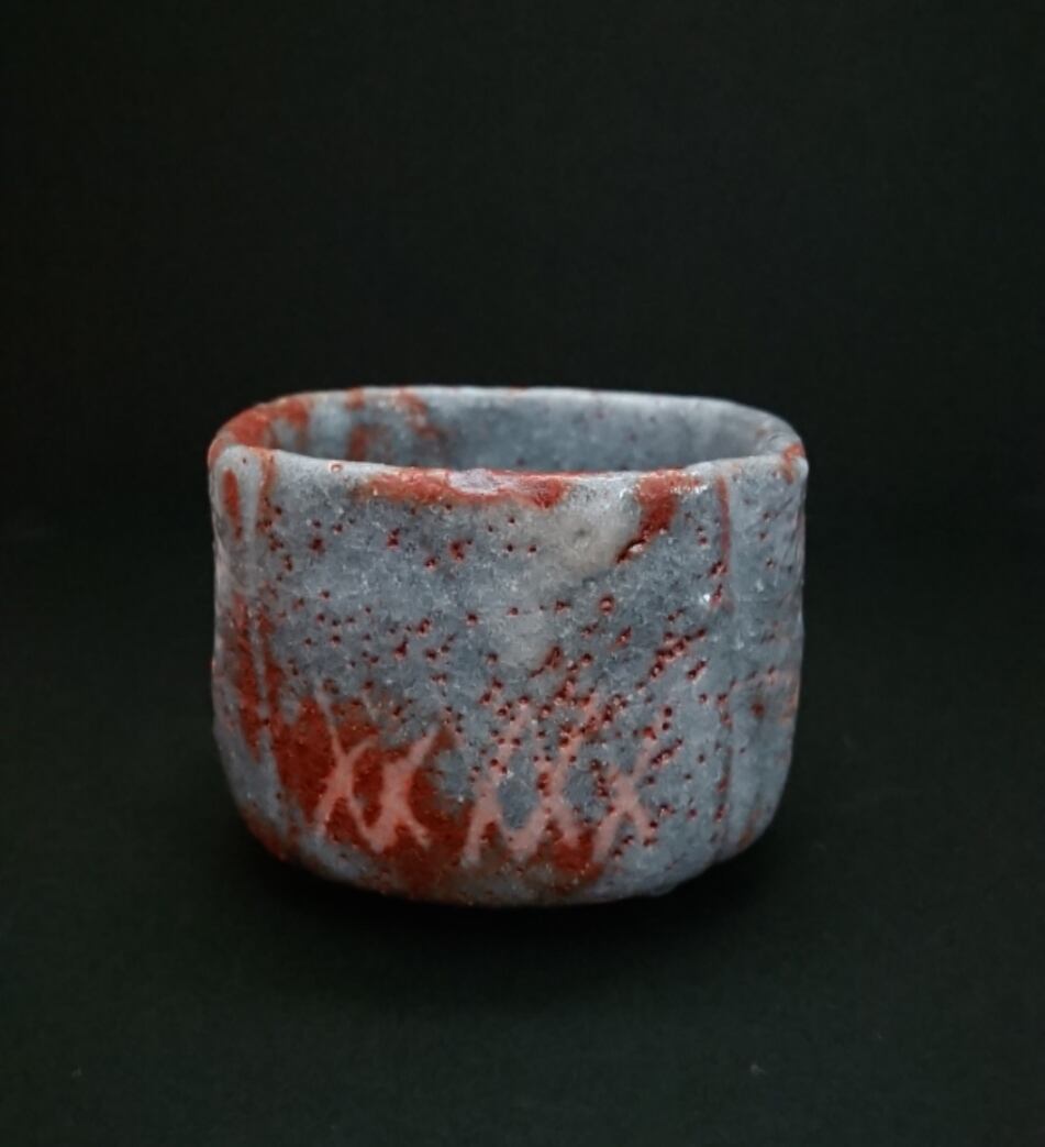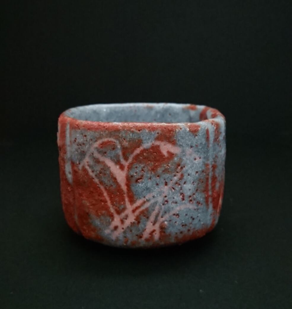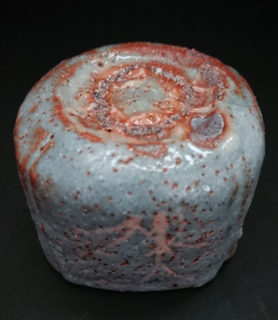 《解説》この猪口の青はとても印象に残る。鼠志野が青を呈するのは珍しくないが、たいていは鼠色に近い青である。対して、この青は特別のようにみえる。だが、それがそのようにみえるのは、その青自体に何かの秘密があるわけでなく、むしろそれ以外の色たちのおかげというところがある。側面に現れた火色の何と鮮やかなこと。そして、鬼板を削って抜いた絵模様がとりわけ濃いピンクに染まっていること。器表でぞんぶんに踊るこれらの補色?たちが、この作品の鼠色をさらに明るい青に仕立て上げている。鼠志野は志野のネガティブを楽しむのがトラッドな観賞の仕方かと思うが、この作品にあっては、志野云々というよりも、器の四方で踊る青、赤、ピンクの色たちの自己主張こそが何よりもの魅力である。最近作家はこの手の作品をあまり手がけてないとのことだが、ぜひこの怪しく美しい鼠の路線を、もっと深化させてもらいたいものである。