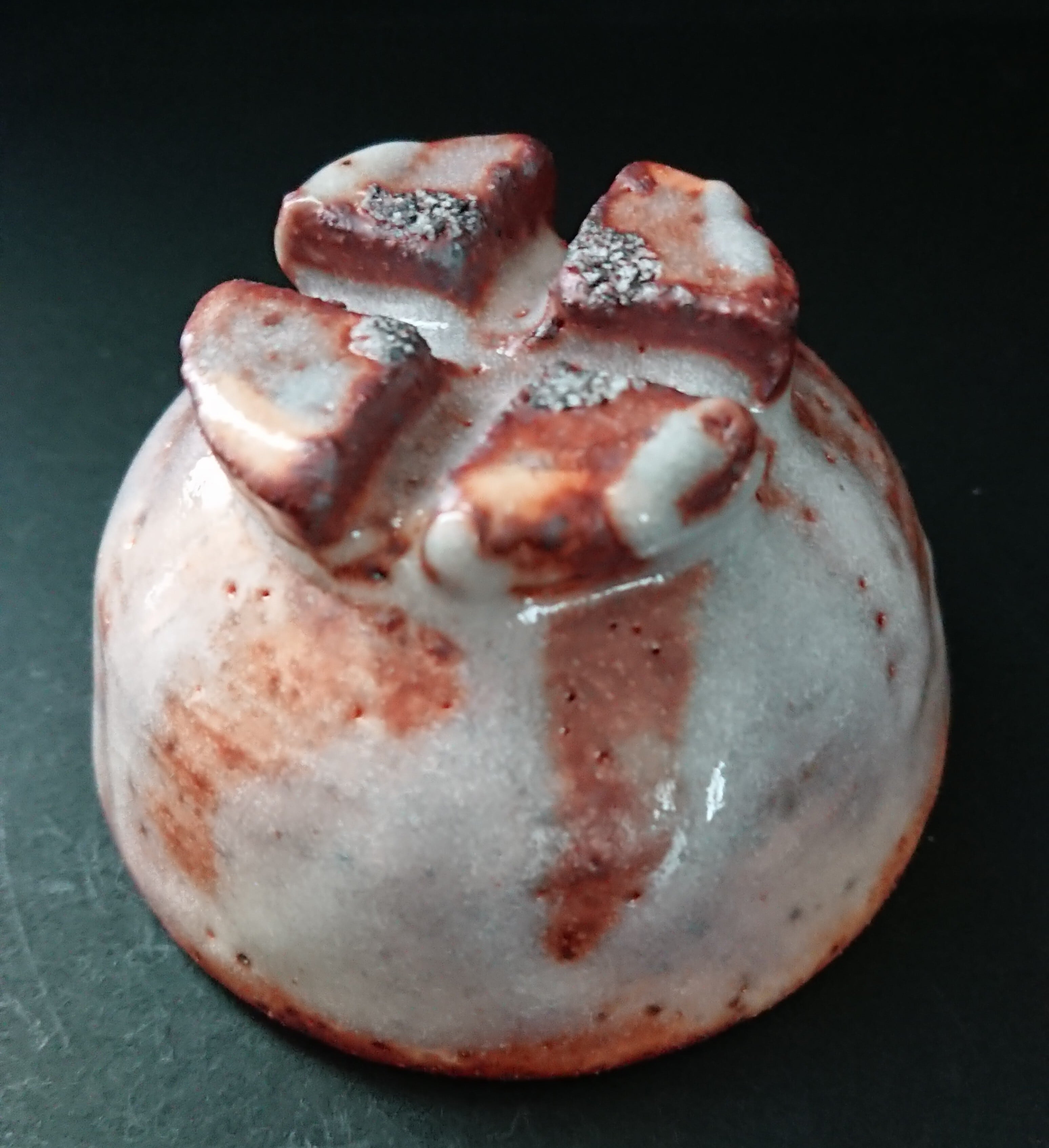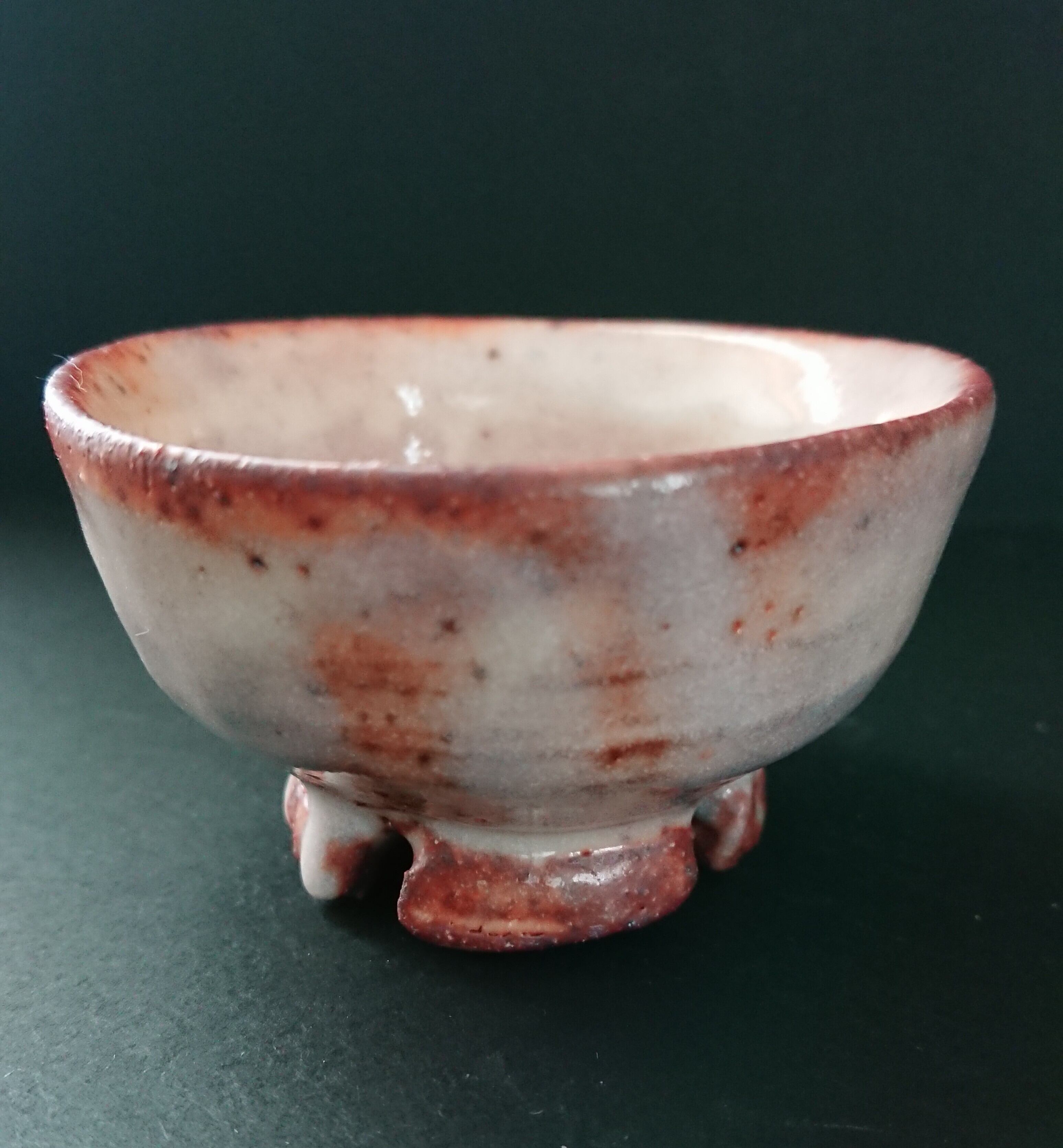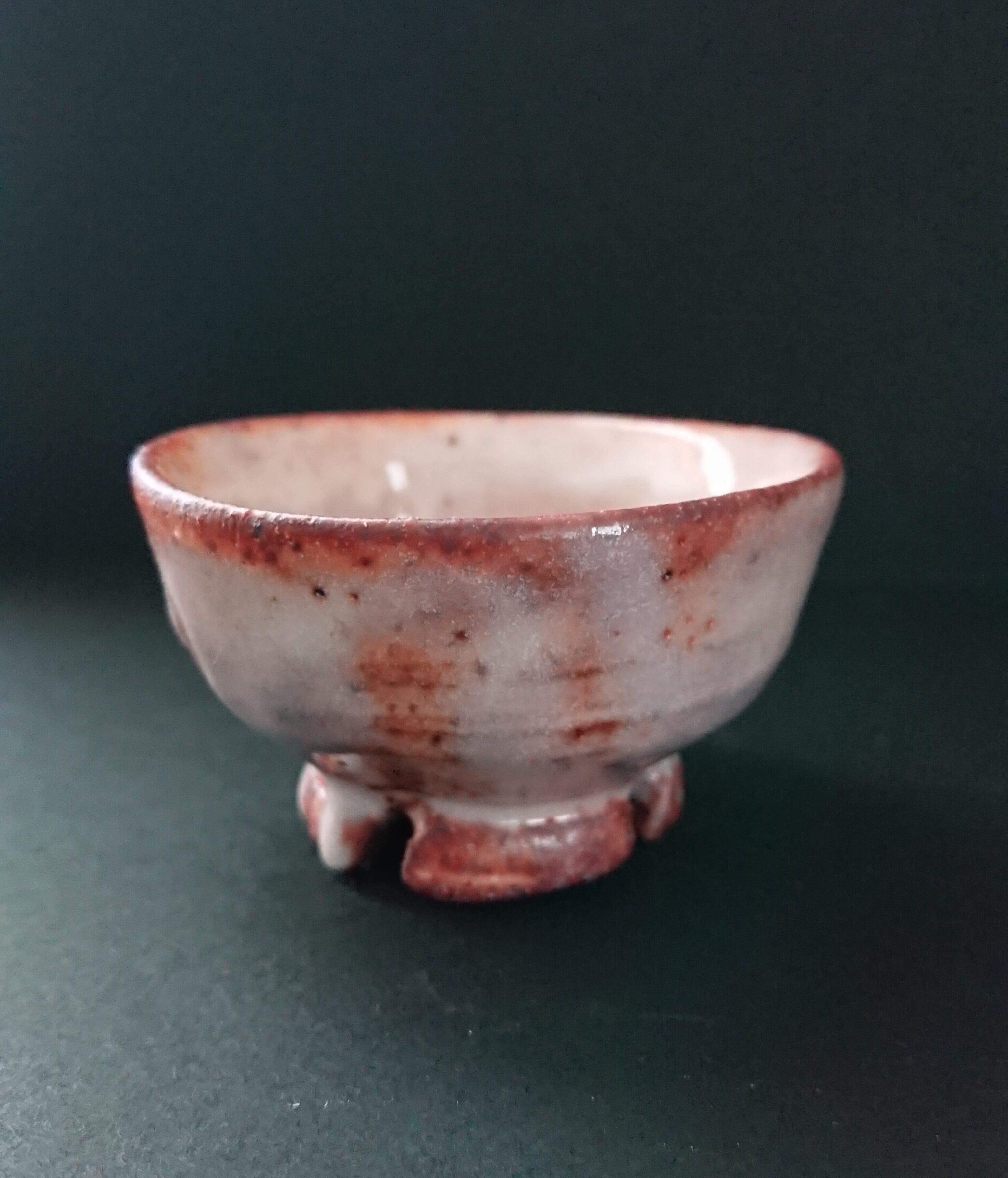 《解説》志野の割高台というのはいかにも例外的で、凝り固まった志野フリークからすると、ちと違和感を覚える。それこそ、現代の作家たちが高麗茶碗の割高台を参考にしてつくってみました、というのならまだしも、古作にそんな志野があるとはなかなか想像し難い。だが現実にはある。「朝陽」という銘の志野茶碗が伝世していて、作家はそれをモデルにぐい呑みをつくった。いろんな形態のバリエーションがあるとはいえ、志野といえば、やはり半筒形である。碗形でしかも割高台というこの形式は、その代表的イメージからずいぶん離れる。このギャップはまさにロシアフォルマリスムのいう「異化」に相当するが、そんな発想が今から四百年も前の日本にあったこと自体が驚きだ。山田さんは、「朝陽」をそのまま写すのではなく、釉調をまったりと上品にした。長石釉が薄くかかったところに濃い火色が差して、ムラムラとした釉調がとてもいい。想像次第でいろいろな情景を投影できる叙情的な作品である。