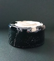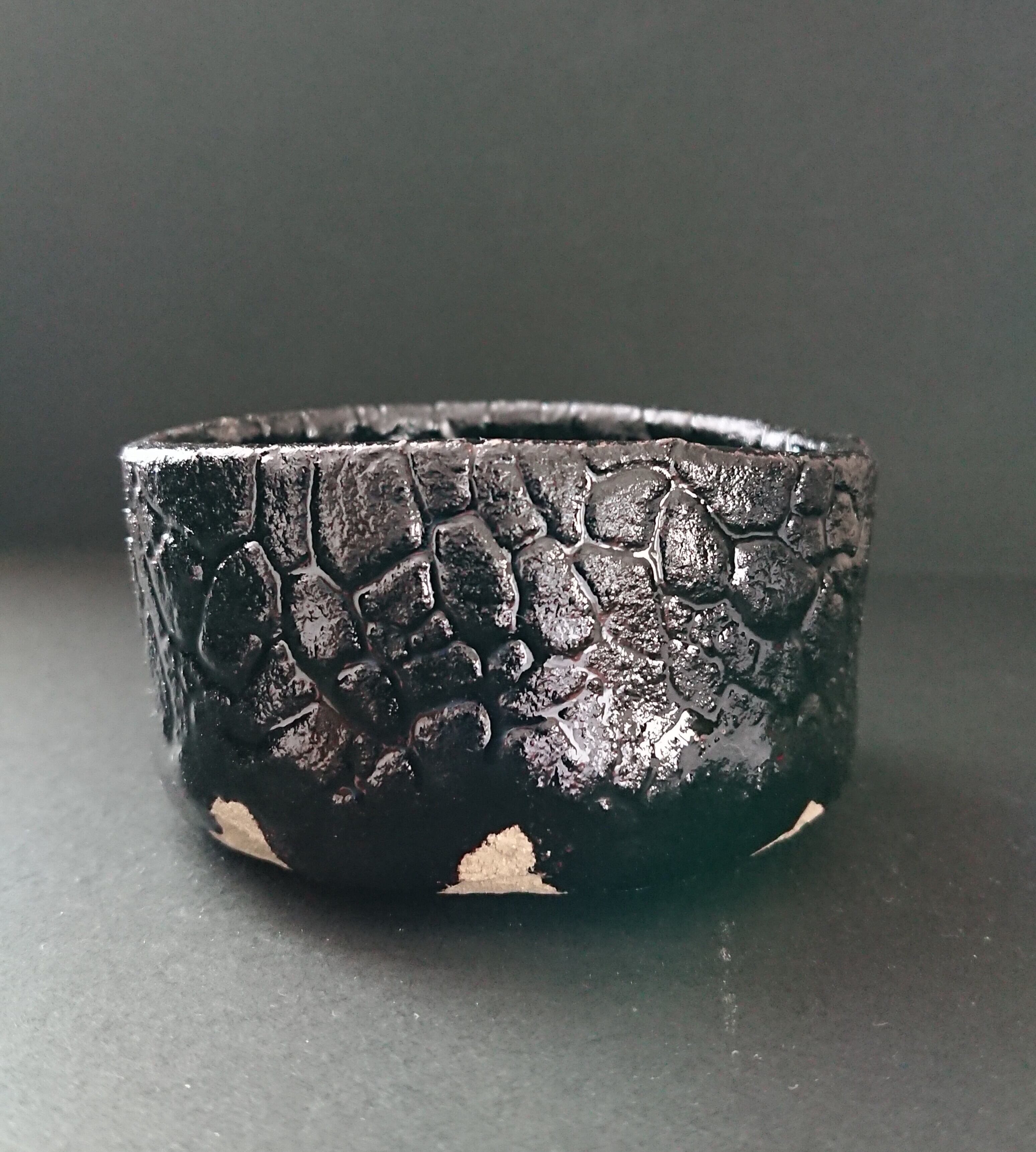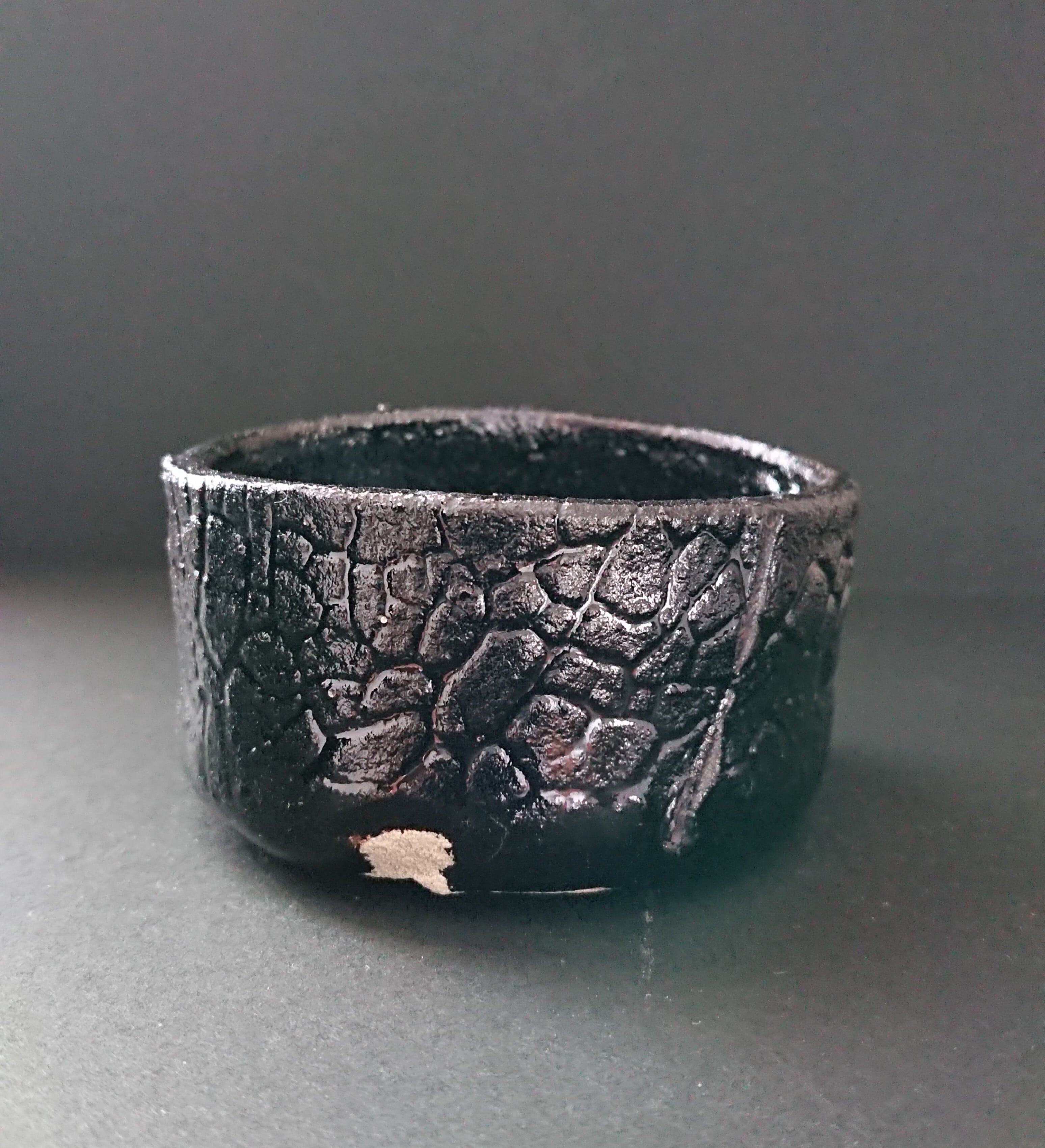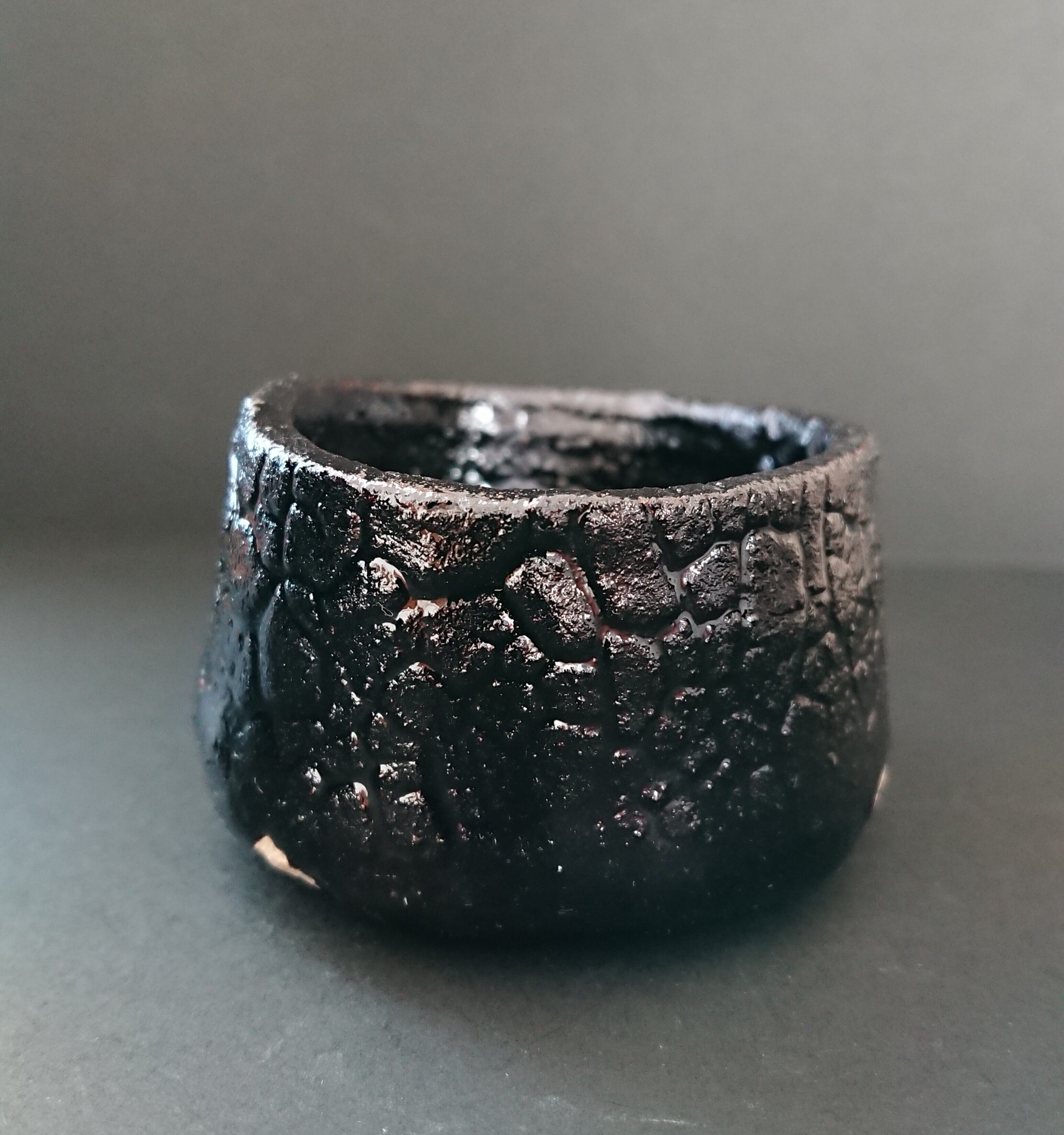 《解説》焼成中の窯から引き出して急冷することにより、仕上がりの表情に艶と深みをもたせるのが瀬戸黒の必要条件である。だから、ときに引き出し黒とも呼ばれる。だが、瀬戸黒の条件はそれだけではない。あるかないかくらい低い高台、真横に張り出した腰、垂直に切り立った胴回り、これらの造形的な十分条件が満たされてはじめて瀬戸黒は瀬戸黒たり得る。それなのに市場に流通する「自称」瀬戸黒たちのなかで、この条件を満たす作品の何と少ないこと!。いずれもお上品なのか何なのかわからない半筒形のものばかりだ。瀬戸黒ファンとしてはこの嘆かわしい状況は何とかならんものだろうかと常々憤っている。都さんは早くから瀬戸黒に取り組んでらっしゃるが、そのつぼをきちんと押さえた作品づくりをしてこられた。そう、この作品のように、瀬戸黒は、盥(たらい)のような造形が最もそれらしくみえるし、カッコいいのだ。必要十分条件を満たした立派な瀬戸黒である。ついでにいえば、窯から引き出すときの引っ掻き傷もその条件に数えられるが、この作品ではそれが外側についていて見処のひとつになっている。
