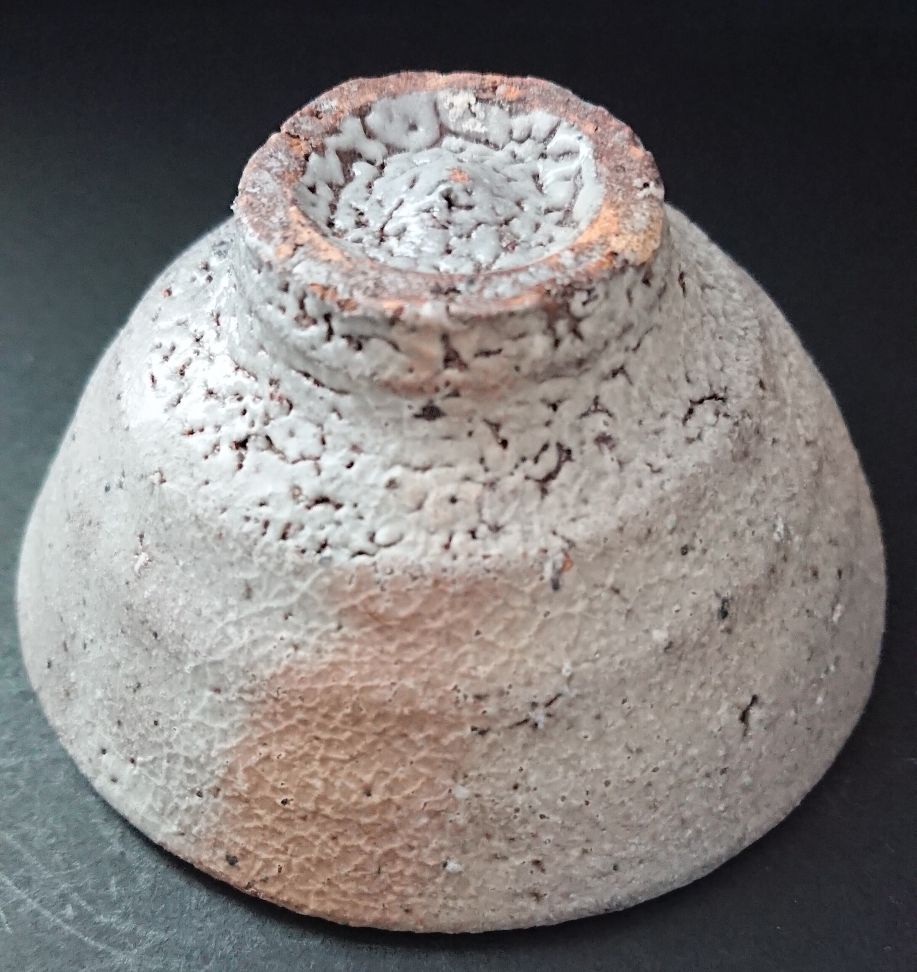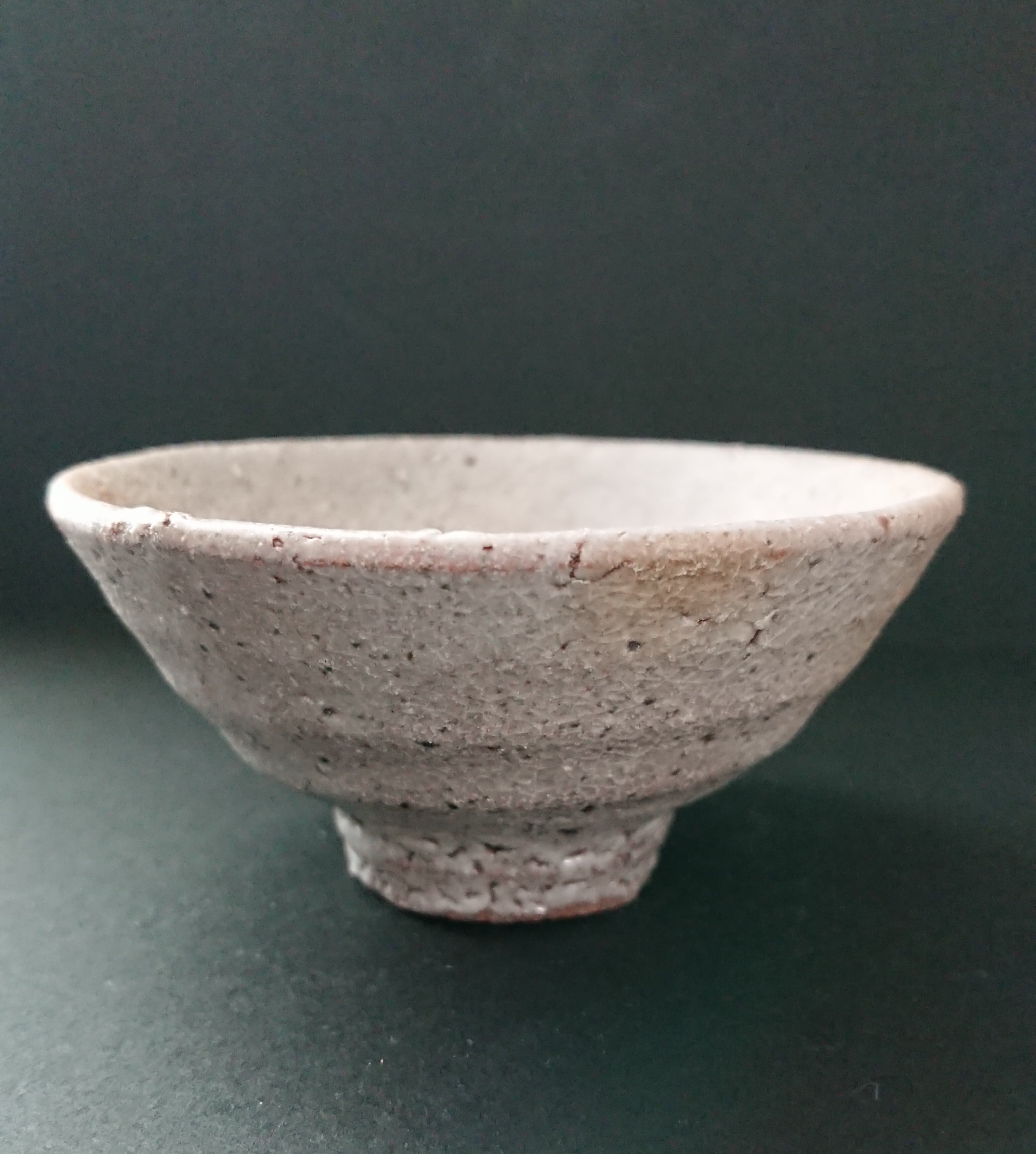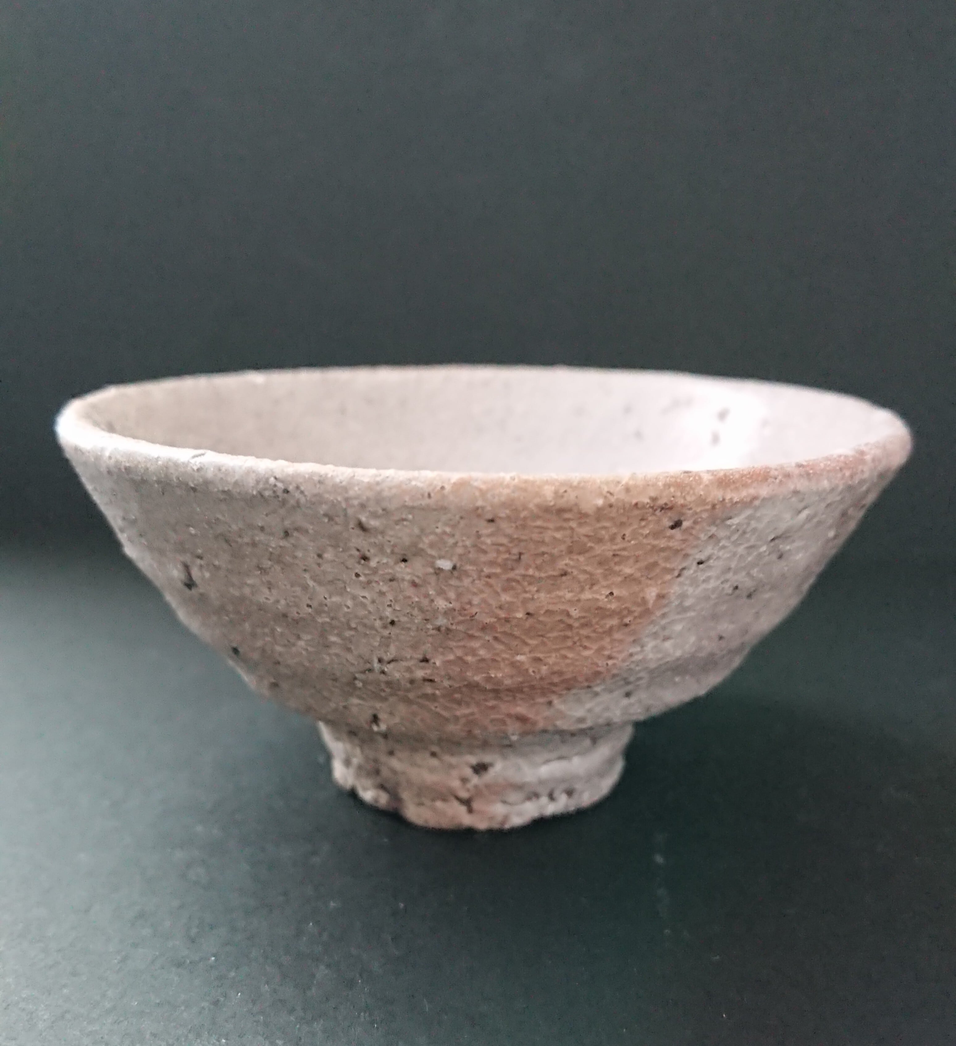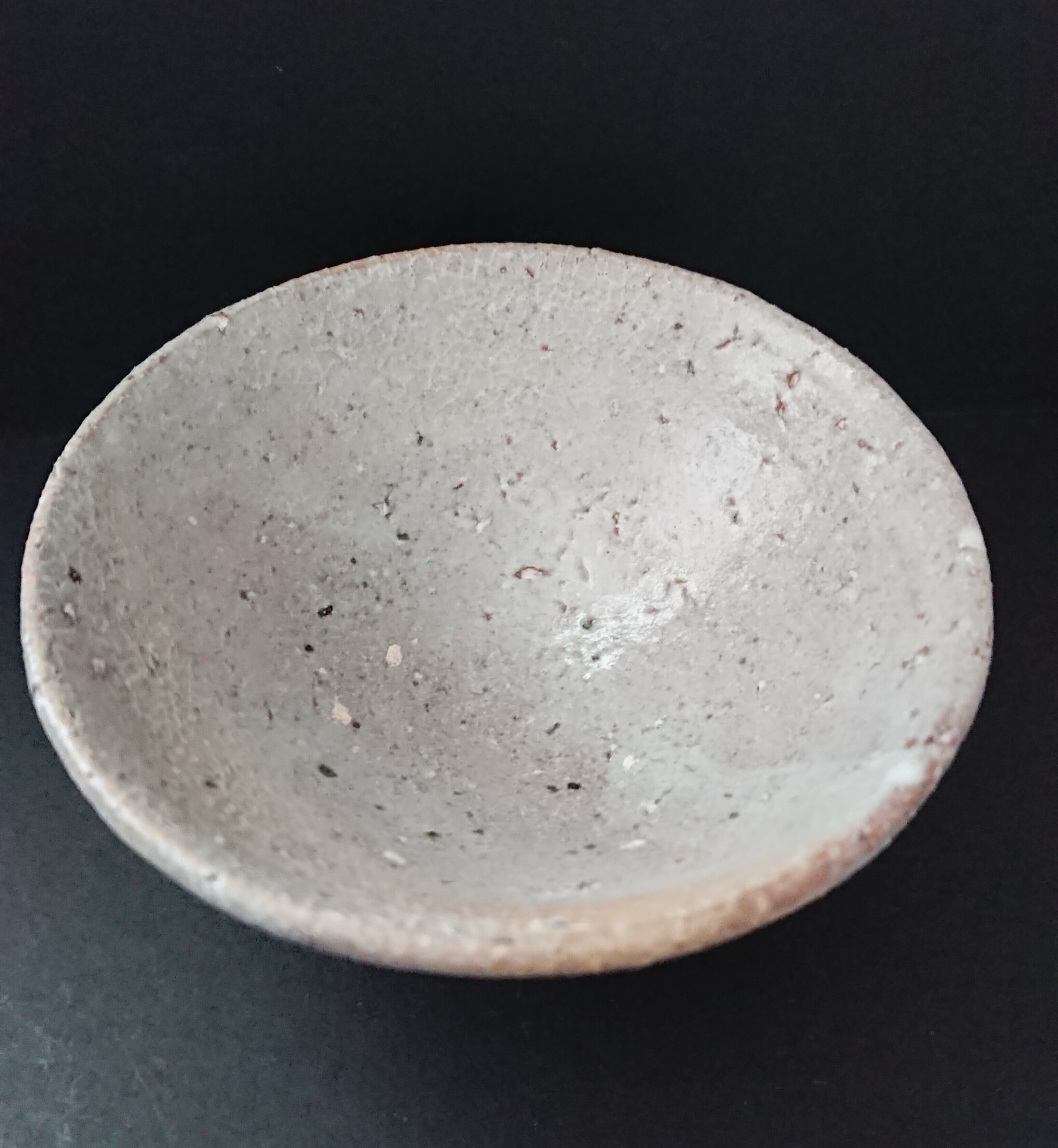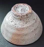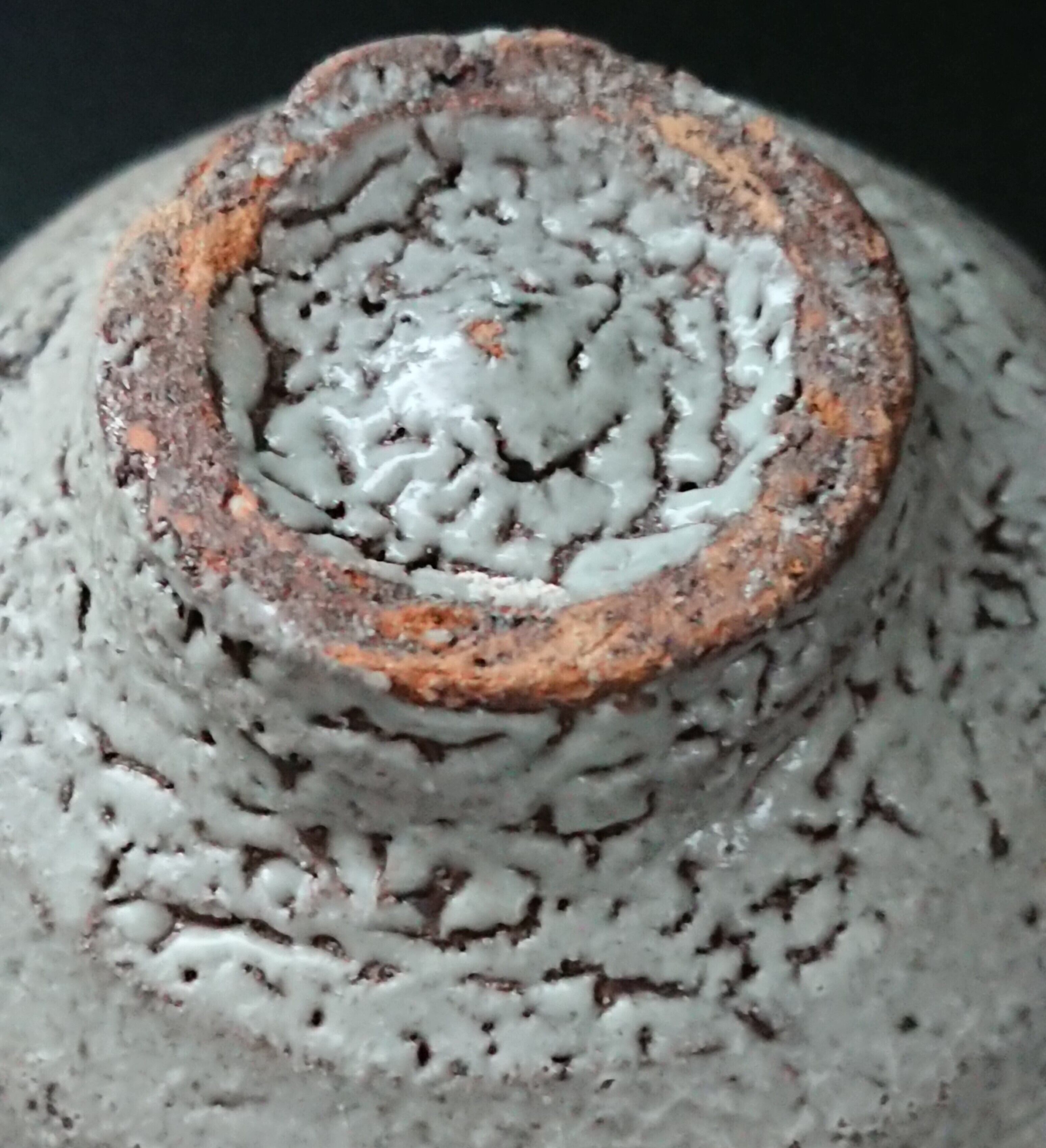《解説》昨年の夏、土岐にある都さんの工房をお邪魔したとき、「最近つくってるんです」といって、井戸盃をみせて頂いた。池西剛さんからすすめられて取り組んでいるということだった。すでにそのときには一部販売もしはじめていて、「お陰様でそこそこ売れてます」とのことだった。そのときの井戸は真っ白で、たいていの井戸が古色を施したうえで発表するのとは異なって、焼き上がりそのままの井戸だった。「美濃の作家が片手間でやっているように思われたくない」という作家の強い思いがその井戸づくりには感じられた。上の作品は、そのときとは違う鉄分の多い土を使用している。「唐津と井戸の中間的なものを」狙ってできあがった井戸だという。全体青みがかっているなかに赤みがさして、とても表情豊かな井戸になっている。確か初めて作家の工房をお訪ねした六年前も、志野だけでなく井戸のような作品も並んであった記憶がある。都さんにとって井戸はけっして「片手間」ではないし、写真の作品もけっして「片手間」でできる井戸ではない。