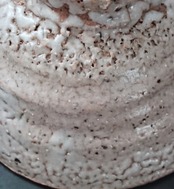 《解説》満を持して柳下さんが井戸に挑んだ。井戸といえば、柳下さんの師匠である杉本貞光師の最も得意とするところで、弟子としてはこれを意識しないわけにはいかない。枯れていて、品があって、なおかつ動きのある杉本師の井戸は、たとえば富士山がはるか遠くに聳えるように、孤高の魅力を放っている。そんな遠くの存在に挑むのだから、手掛けるまでに長い時間を要したことは想像するに難くない。しかも、この師弟関係にあっては、ともにやきものの研究や実践に励むが、師が弟子を手取り足取り教えるわけではない。柳下さんは、土や釉薬を一から自分で試行錯誤して探し出した。何度もテストを繰り返して、これと満足できる仕上がりになったのがこの井戸だ。師匠からも御墨付きをもらった。作家がとくにこだわったのは、のっぺりした土肌ではなく、陰影のある表情と、胴部にクレーターのような凸凹があるようにすること。このねらいが功を奏して、師匠の井戸に肉薄している。何とも叙情的な井戸ではないか。