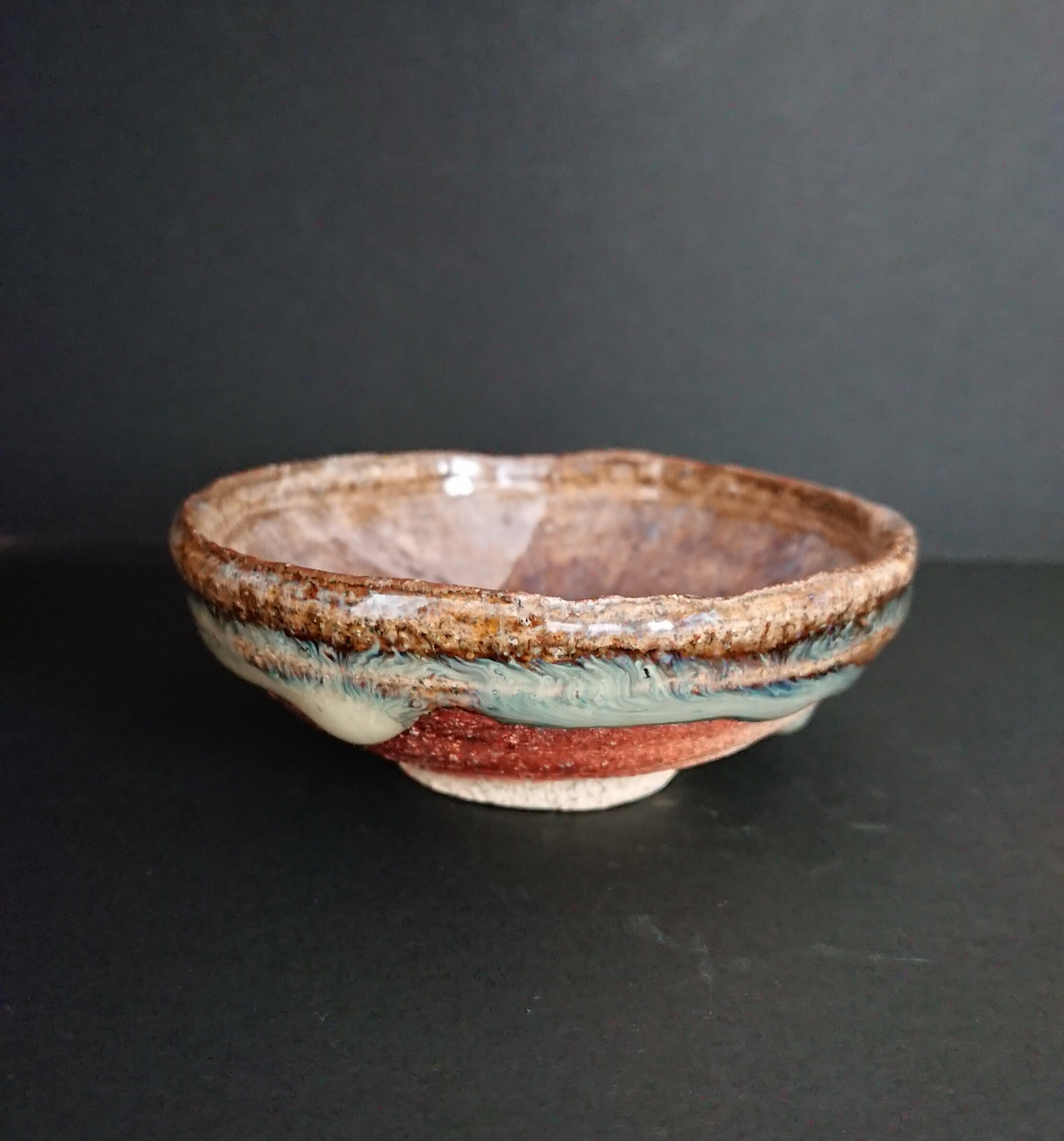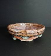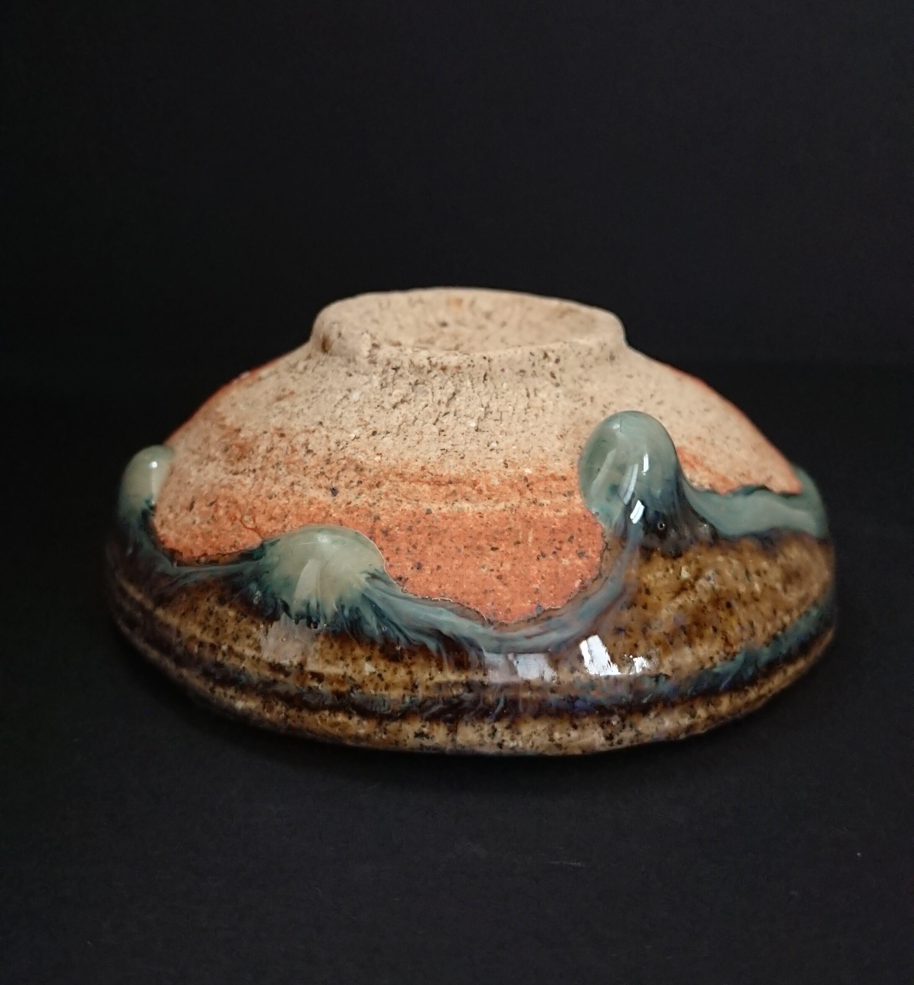 《解説》唐津で灰釉といえば、青唐津か黄唐津をまず思い浮かべる。いずれも木灰を主とした釉薬を掛けるが、灰のなかの鉄分が、酸化焼成だと青くなり、還元だと黄色く発色する。青磁に青いのと黄色いのがあるのと原理的には同じである。この平盃は、しかし、そのいずれでもない。パッと見は、黒っぽい見込みに海鼠状になった青白い釉が溜まって、どちらかというと、朝鮮唐津に近いようにみえる。だが、その黒っぽい釉調をさらにじっと見詰めると、その黒が青っぽくも黄色っぽくもみえてくる。口縁の外側にダイナミックに垂れる釉の雫(しずく)にしても、朝鮮唐津にみる海鼠よりもはるかに濃い色彩を帯びる。この釉薬には、おそらく、結果として灰と呼ぶ以外にないほどの成分が混ざっていて、しかもそれが土と炎と反応することで、これほど複雑な表情をもったのだろう。火色も、濃い赤から鮮やかな赤へとグラデーションが美しく、まさに観る者に目を離す隙を与えない。作礼さん渾身の一作である。