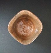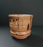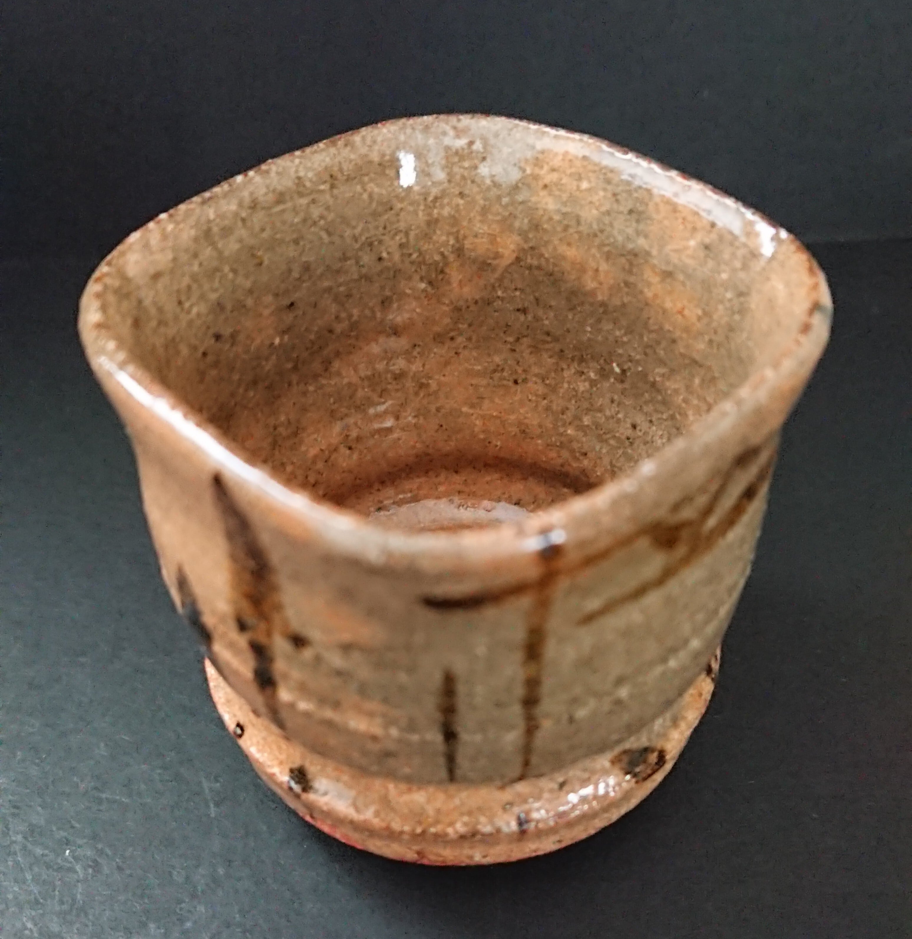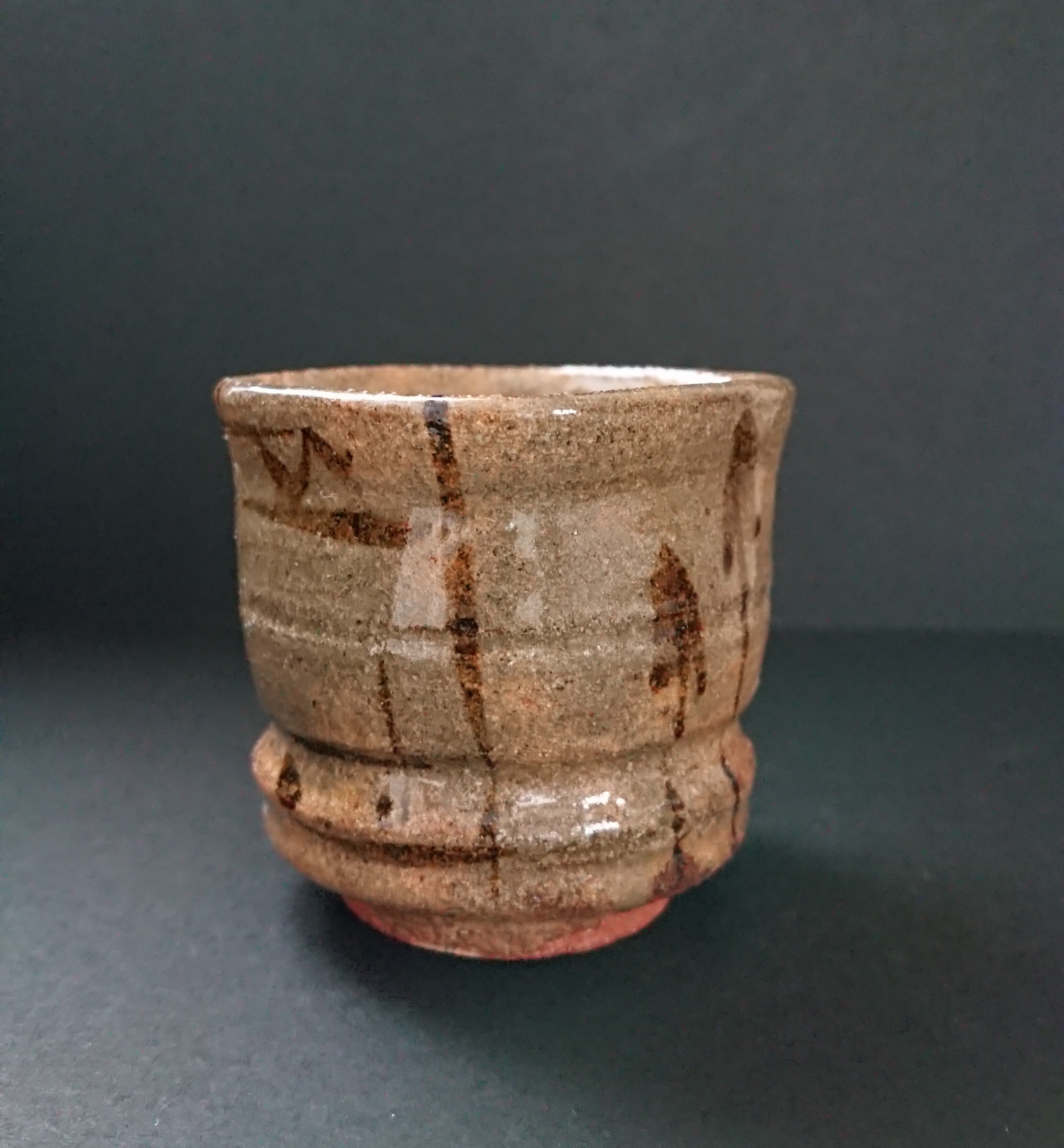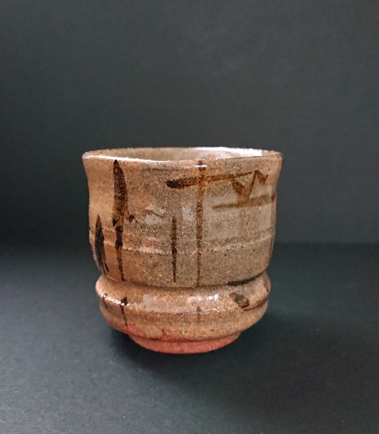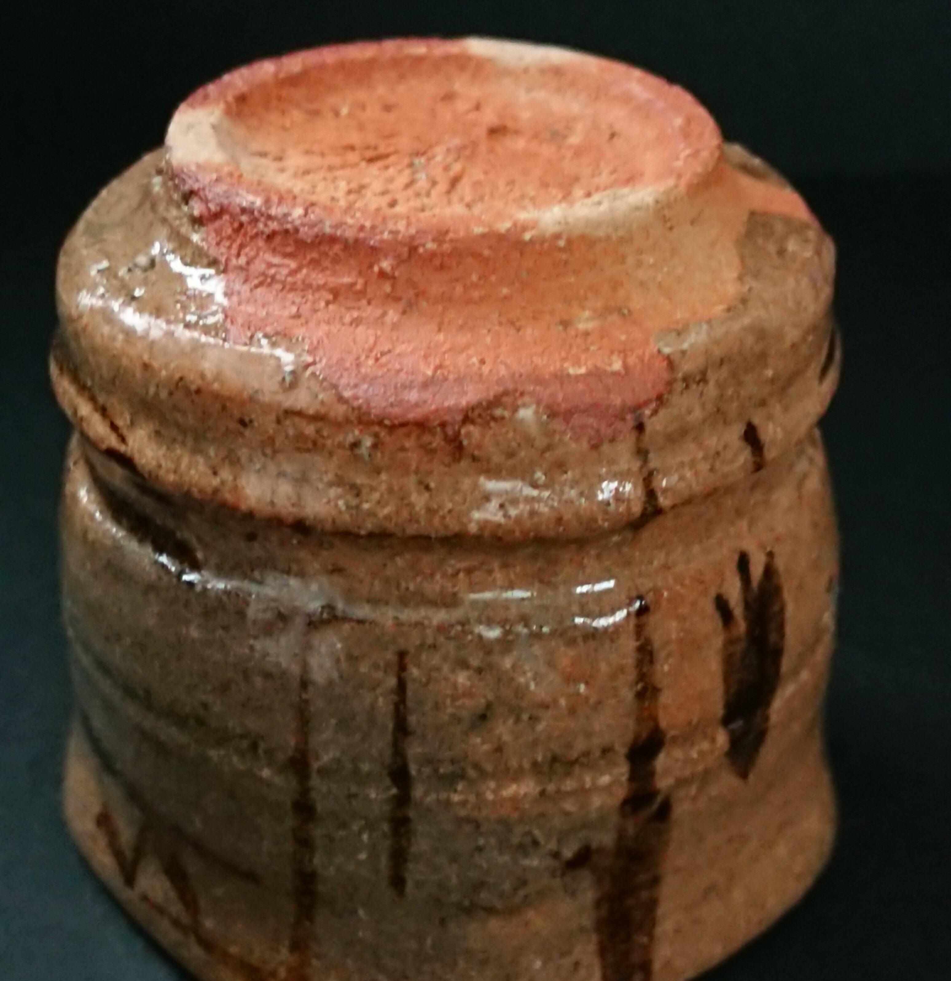 《解説》古唐津の数ある類なかでも、絵唐津は、素朴で野卑なところに魅力がある。茶碗にしろ、花入にしろ、思い切り良くロクロでサッと引いて、勢いにまかせて鉄絵を施しているのがいい。下手な細工はかえって邪魔になるというのが唐津好きの常識である。作礼さんのこの絵唐津は、しかし、その常識からすると、ちとハズれている。口を四方に整え、胴部に大小ふたつの絞りと二本の線を施してつくり込む。全体の姿からすると、素朴とか野卑とかの形容よりも、可憐で繊細といったほうがいい絵唐津である。古唐津のイメージそのままの作品はいいに決まっているが、そこに自分の痕跡を残すことができる作家は限られている。「作礼節」とでもいうべきか、この方の造形力にはいつもながら感服だ。加えて、この絵唐津は焼きがいい。釉薬の藁灰を薄くしているために、窯変による土の表情がそのまま浮かび上がる。大きくは酸化の赤と還元の青の片身替わりだが、それぞれに入り乱れて細部は赤青でムラムラだ。こんな焼き肌をみると、筆者などはゾクゾクするのだが、これは作家が絵唐津に対するときにしばしば取る手法である。土見せの火色も鮮やかでいい。あまり褒め言葉ばかりだと嘘っぽくなるので、この辺でやめておく。