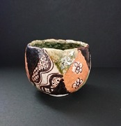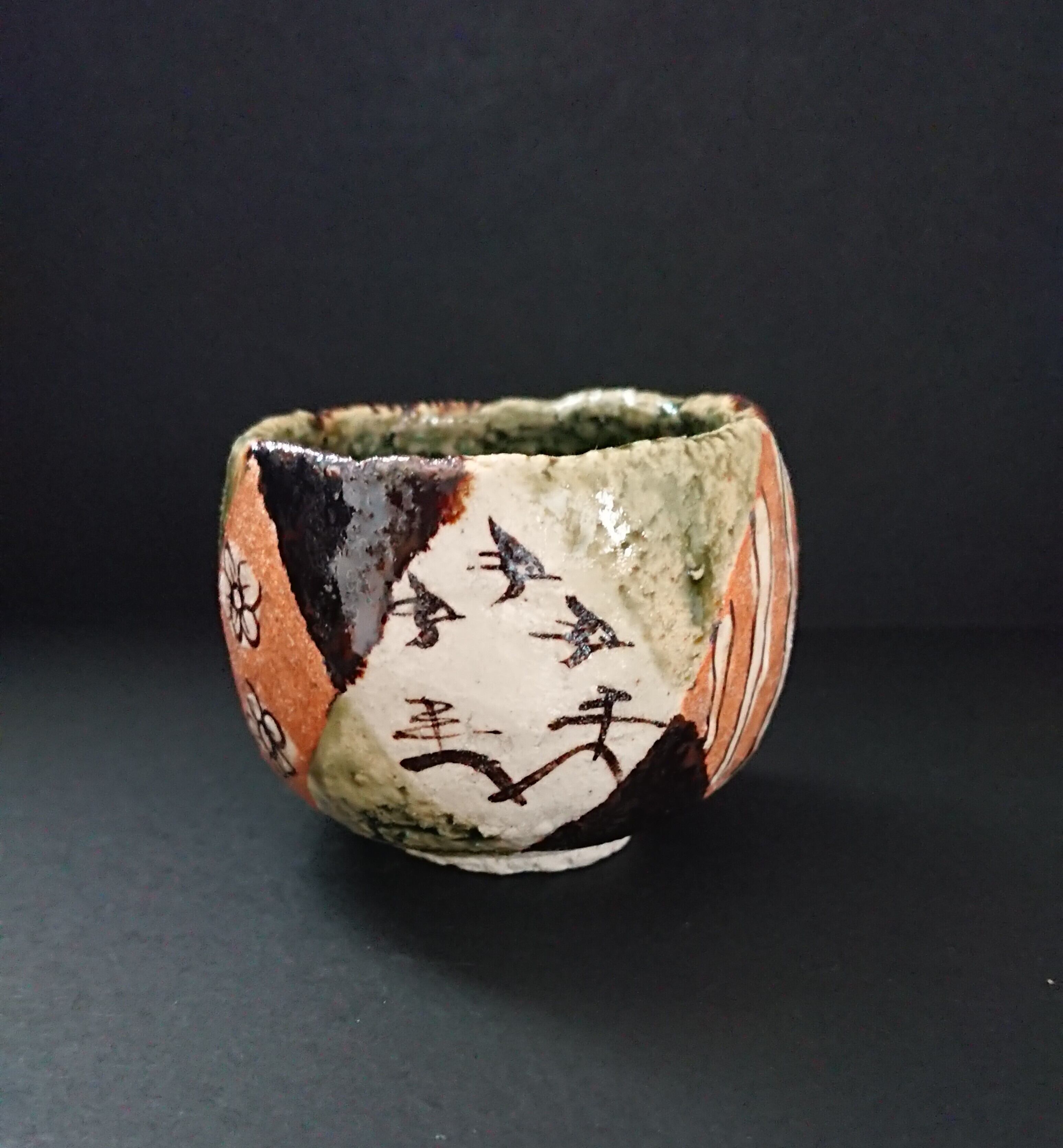 《織部(oribe)》Types of so-called Oribe ware include oribe black, black oribe, green oribe, total green oribe, narumi oribe, red oribe, and yashichida oribe. In this work, Mr. Nishioka alternately connected kurooribe, drawn pictures on white space in black glaze, and narumioribe, drawn pictures on red clay in green glaze. As a result, with the exception of yashichida, the four techniques that make up Oribe ware coexisted in one cup. He named it "Shisai"(four colors). Yashichida is a special Oribe ware created after Oribe's death. So it can be said that this work incorporates all the charms of Oribe ware.