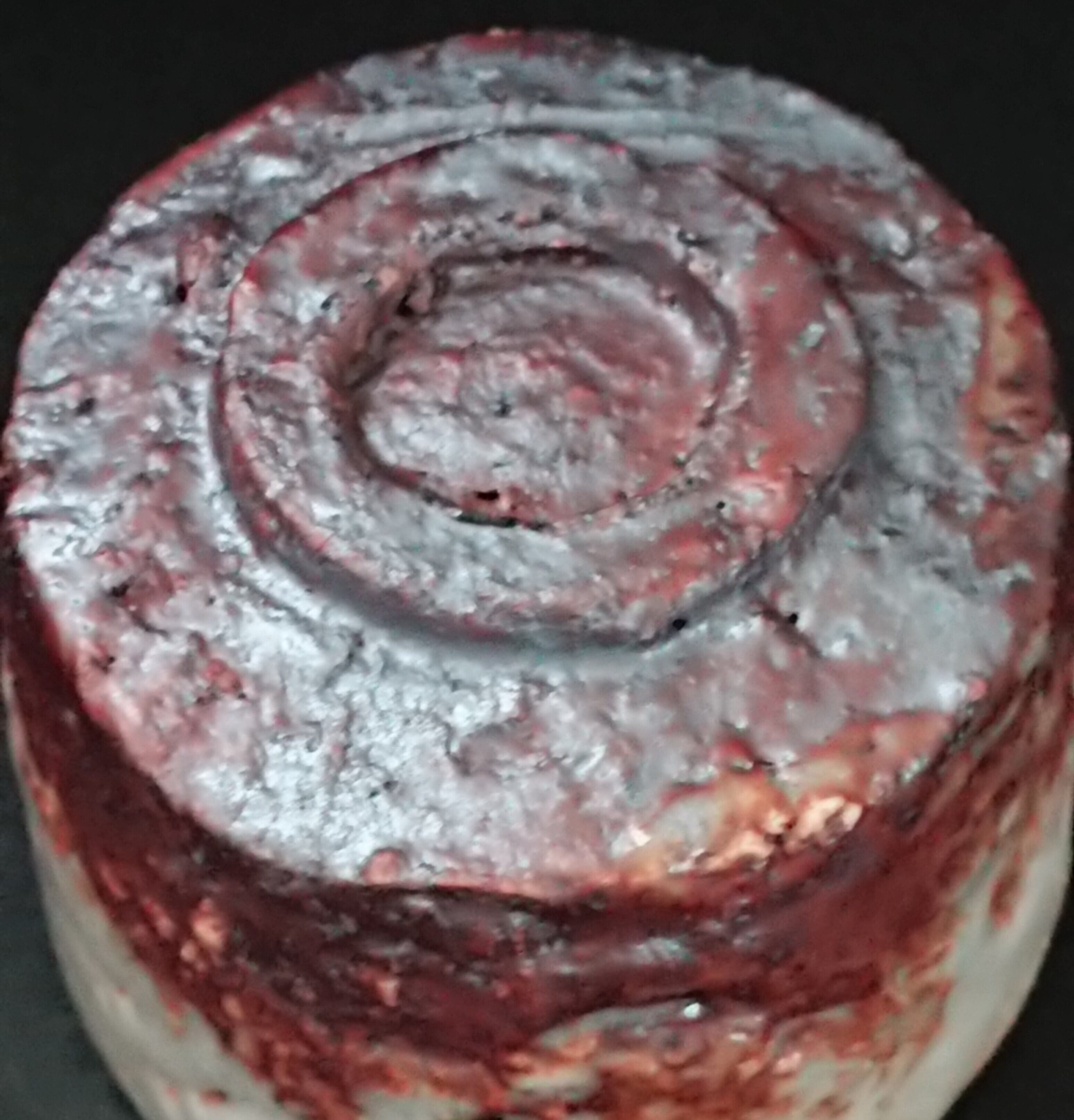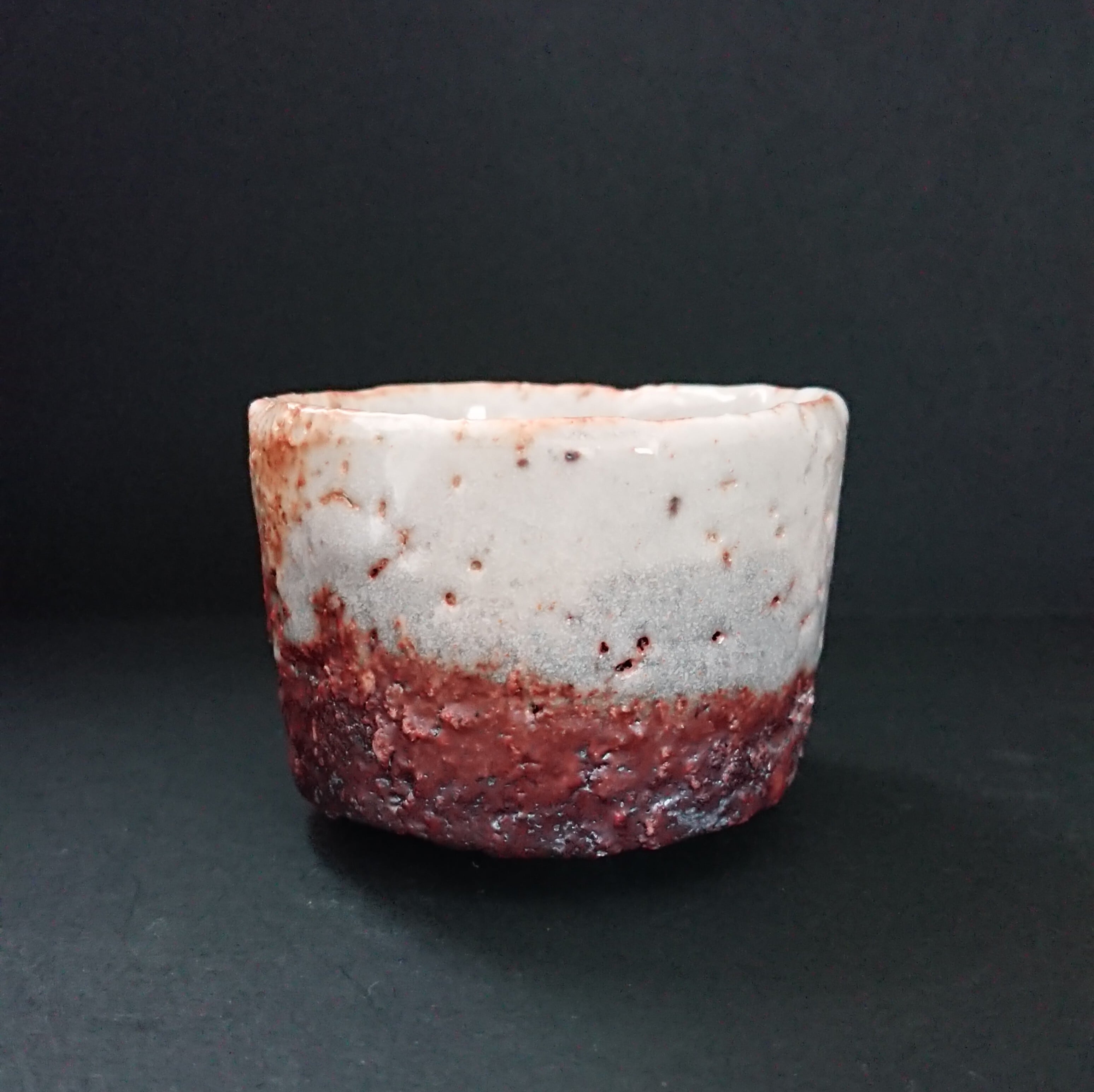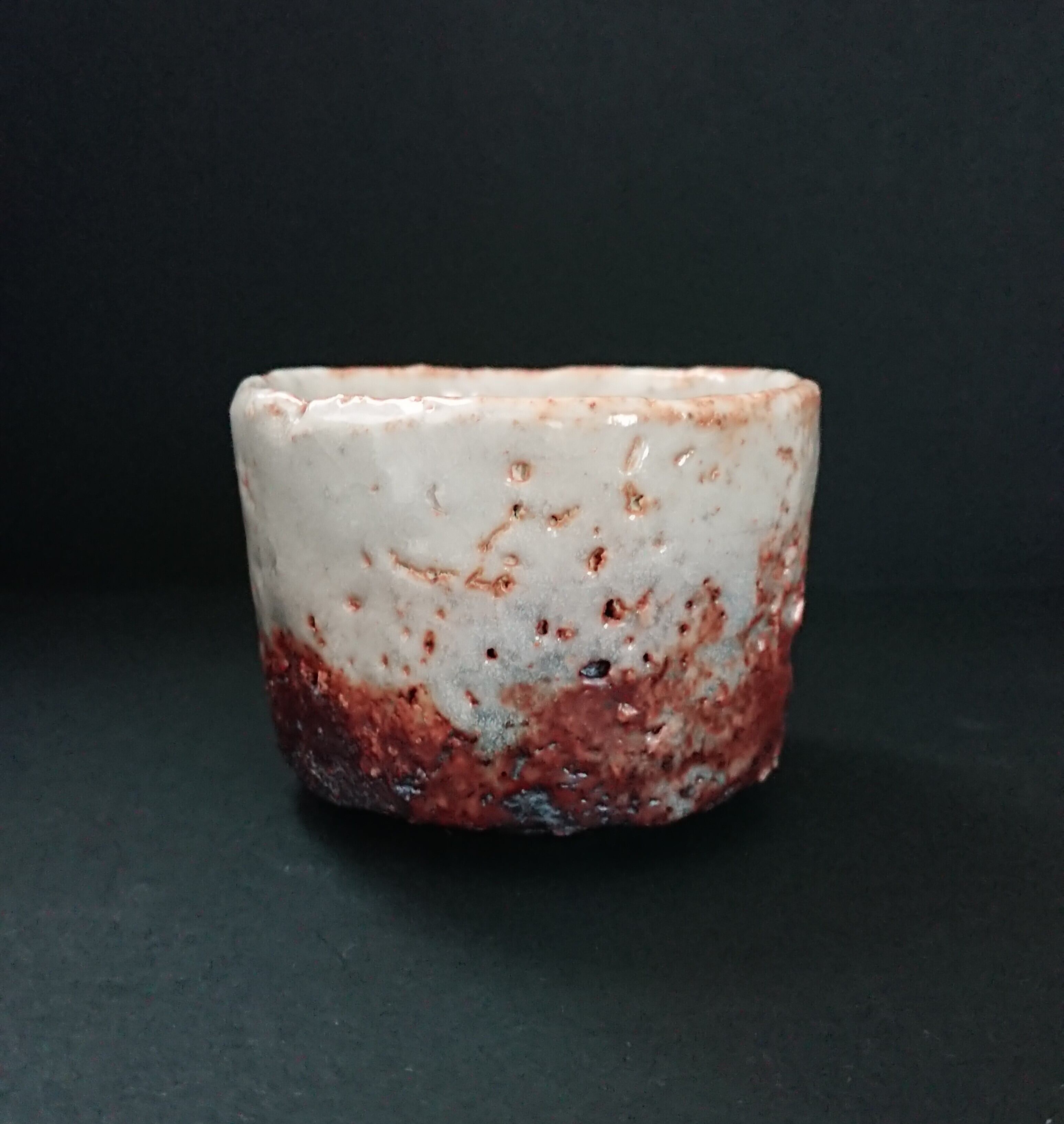 《解説》山田さんは、この企画展への出品をお願いする前から、光悦の「不二山」を意識した作品を手掛けていた。本歌の独特な形と白楽の質感が志野と強い親和性で結ばれていることを敏感に察知してのことだろう。昨年の京都での個展でそれを拝見したとき、その目のつけどころに感心した。それは、確かに、「不二山」にはちがいないが、本歌を想わせないほどに志野に同化している。極端にいうなら、桃山の志野茶碗にいかにもありそうなほど、その形式が馴染んでいる。本作を観れば、それは容易にわかろうというものだ。長石釉と鉄と火色が本歌にはない分厚いグラデーションを構成する。しかも、それが四方から眺めるとそれぞれに異なった顔をみせ、形式のバラエティを楽しむことができる。ところが、高台とその周りはいかにも本歌に忠実で、裏返してはじめてそれが光悦由来であることに改めて気づかされる。山田さんのこの作品は、富士山の、近くにあるようでいてときに遠くにもみえる不思議な様相を的確に捉えている。