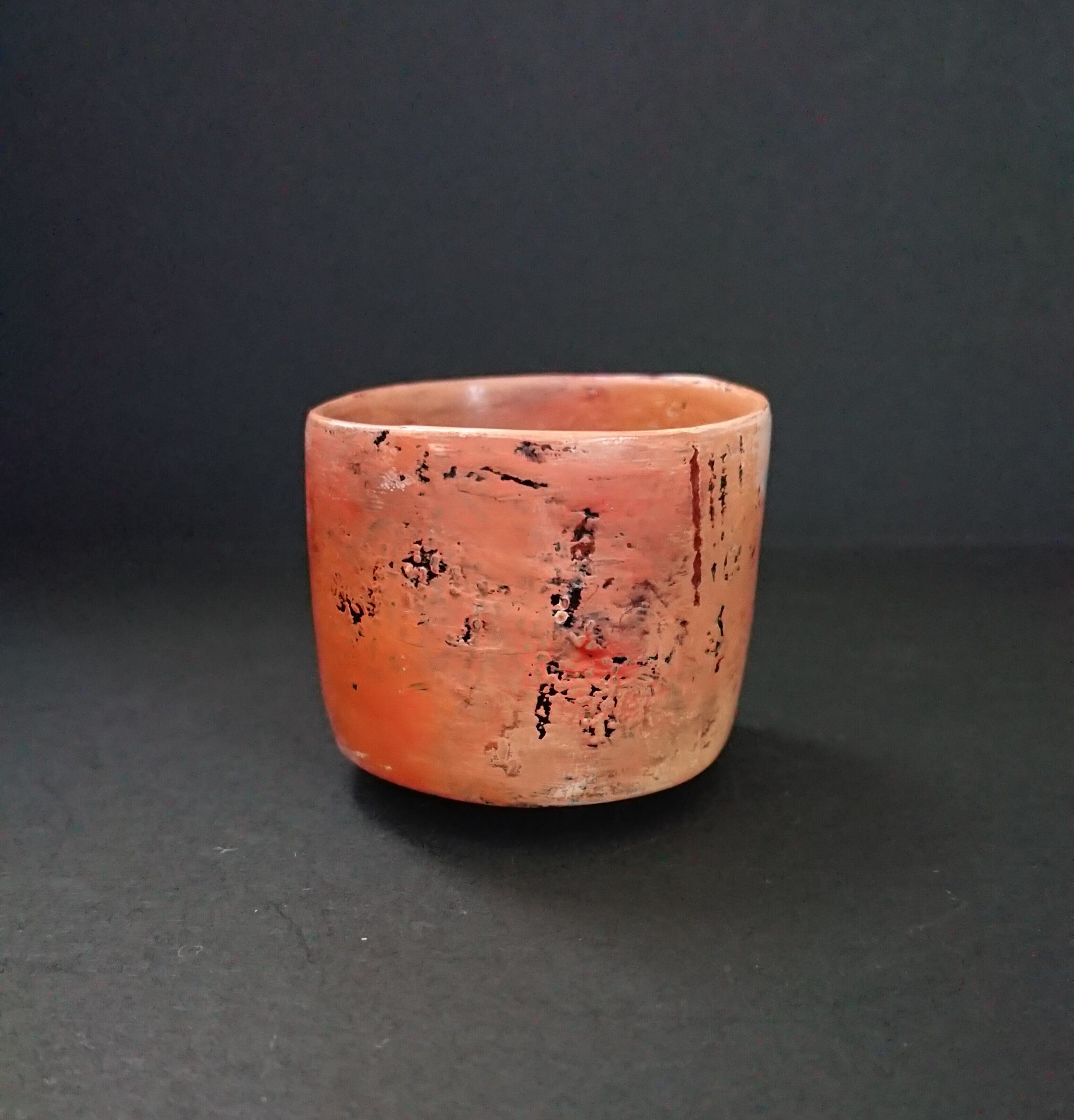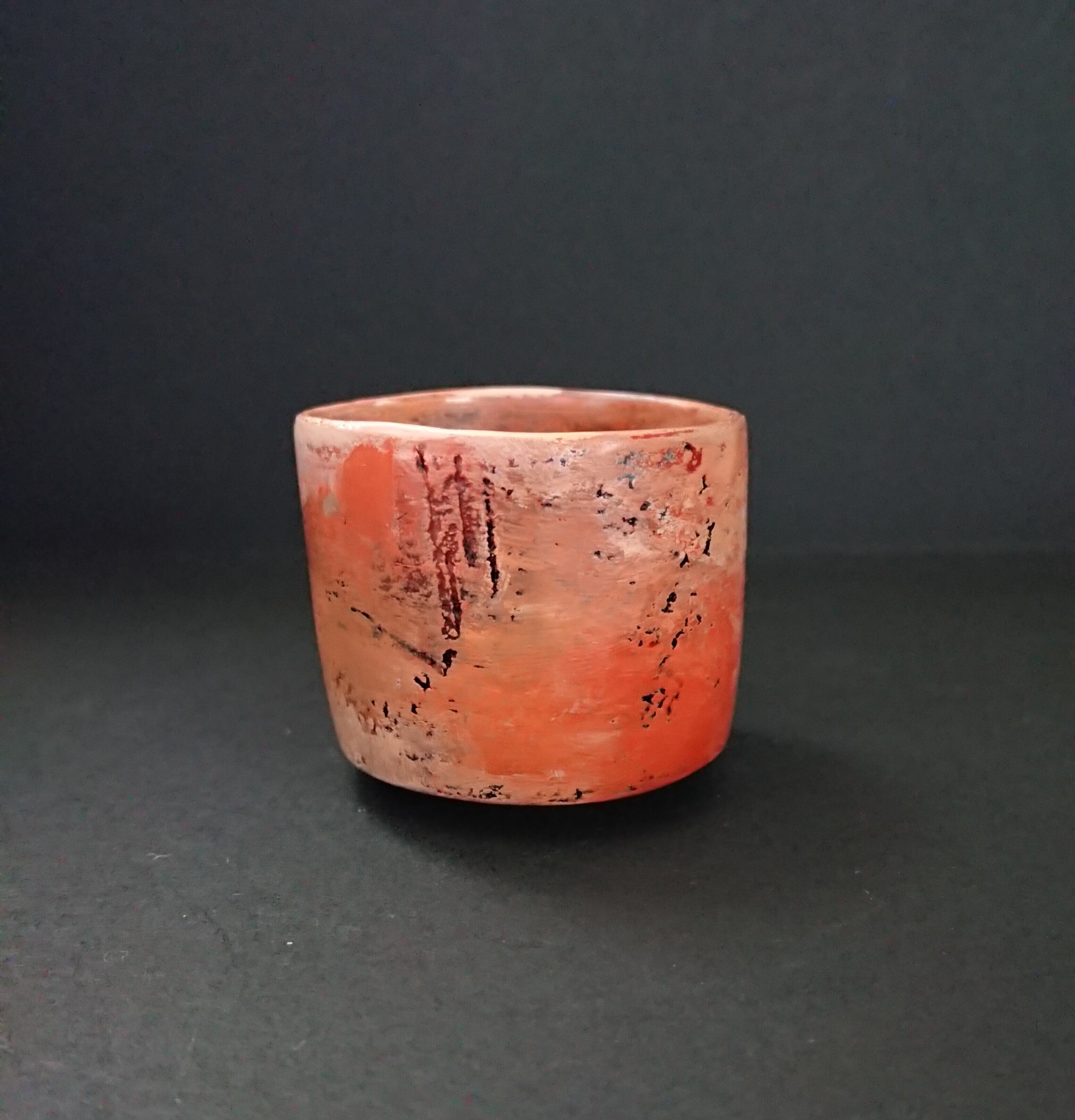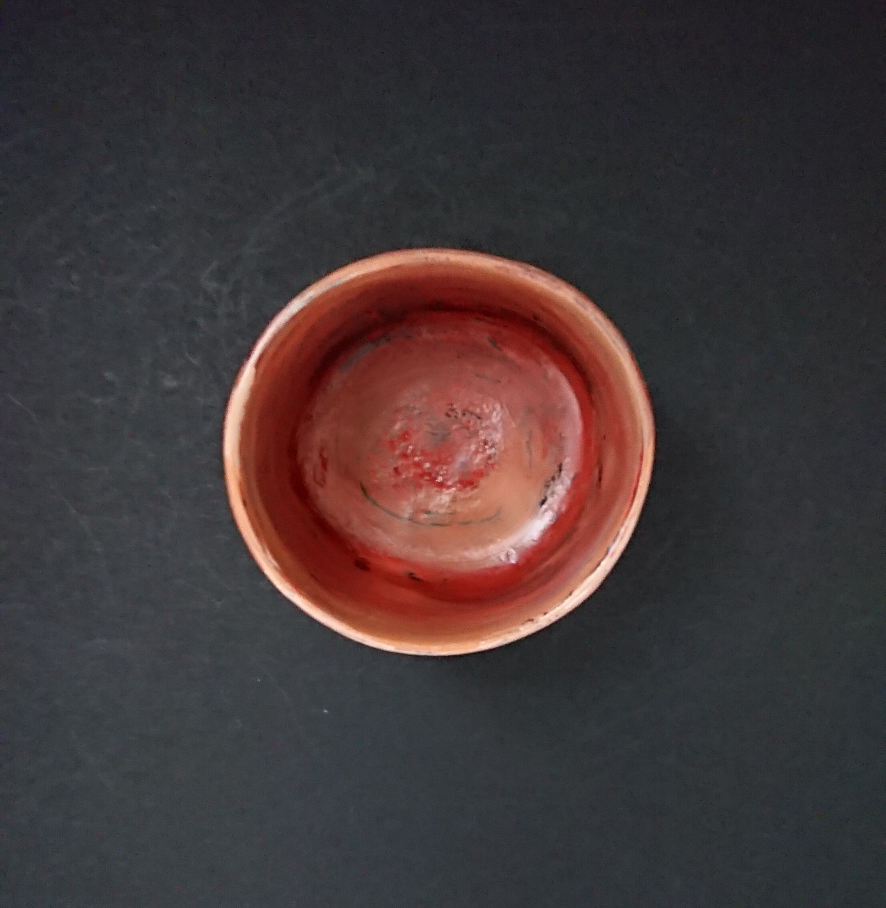 《解説》もうずいぶん前になるが、哲さんが乾漆で長次郎を想わせる茶碗をつくっているのを観て、漆でこんな面白いことができるのなら、光悦みたいなぐい呑みできませんか、と無理をいった。そういわれると俄然闘志が沸いてくるこの方の性格からして、断られるはずがないとの計算済みである。「で、どんなんがいい?」と返事を頂いたので、咄嗟に、「加賀」なんかどうですか、と応えた。この茶碗は、光悦の異形だらけの茶碗のなかでとくに飛び抜けている。それこそ作為だらけの作品で、柳宗悦からすれば、最も忌み嫌うべき茶碗の代表格だろう。その作為のひとつとして、器胎に白泥や黄土や釉薬を塗り重ねて景色をなしていることが挙げられる。どうやってこれを実現したかわからないほど、この茶碗の制作工程は謎に満ちている。ただ、少なくとも最終的な表現として複数の色彩が重なることで「加賀」の「加賀」たる所以が成立しているとすれば、この形式は、漆芸と親和性があるにちがいない。案の定、面白い作品をつくって頂いた。そのうちのひとつは筆者の手元にあるので、この作品は別の機会に作家が手掛けたものである。