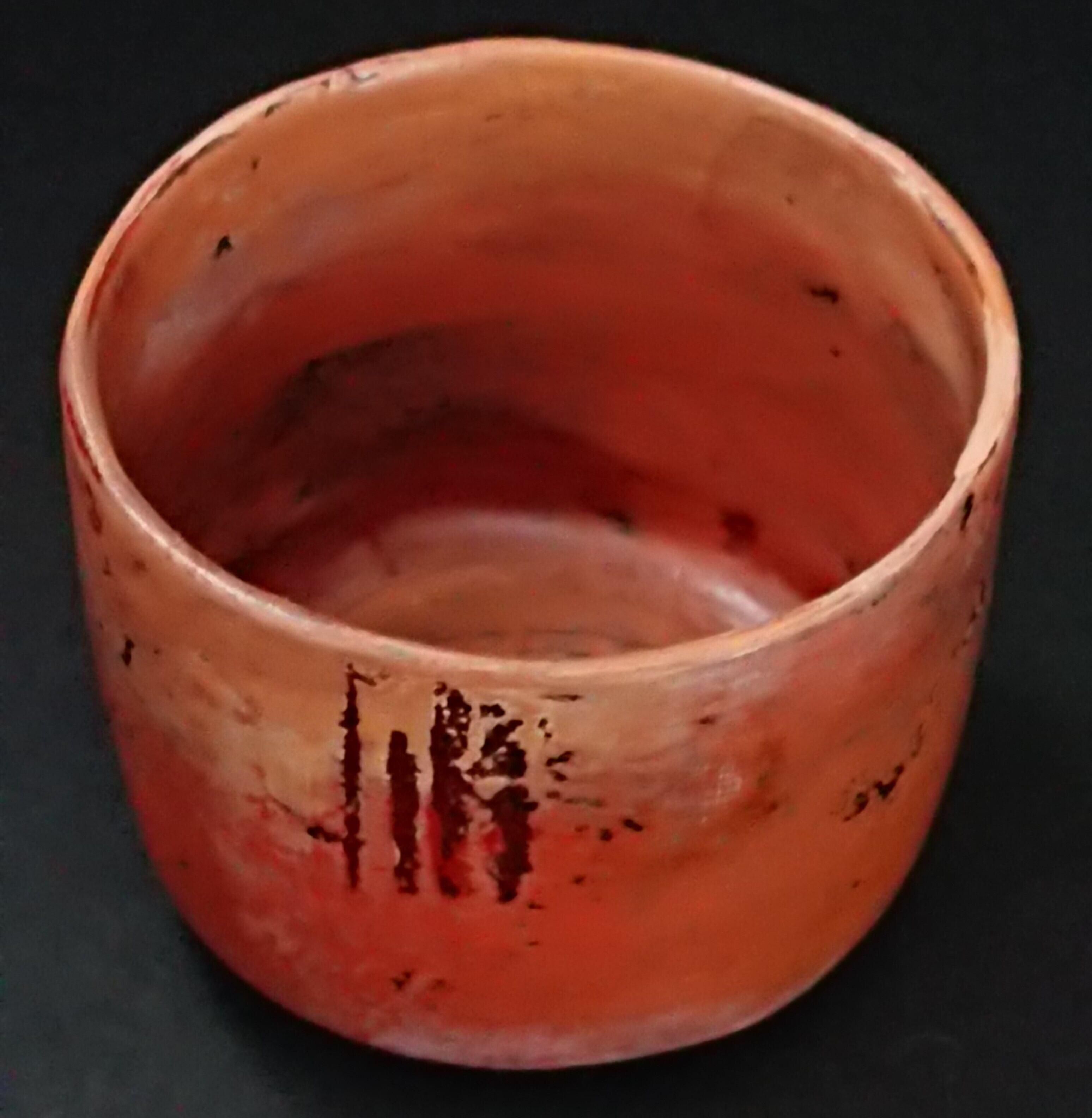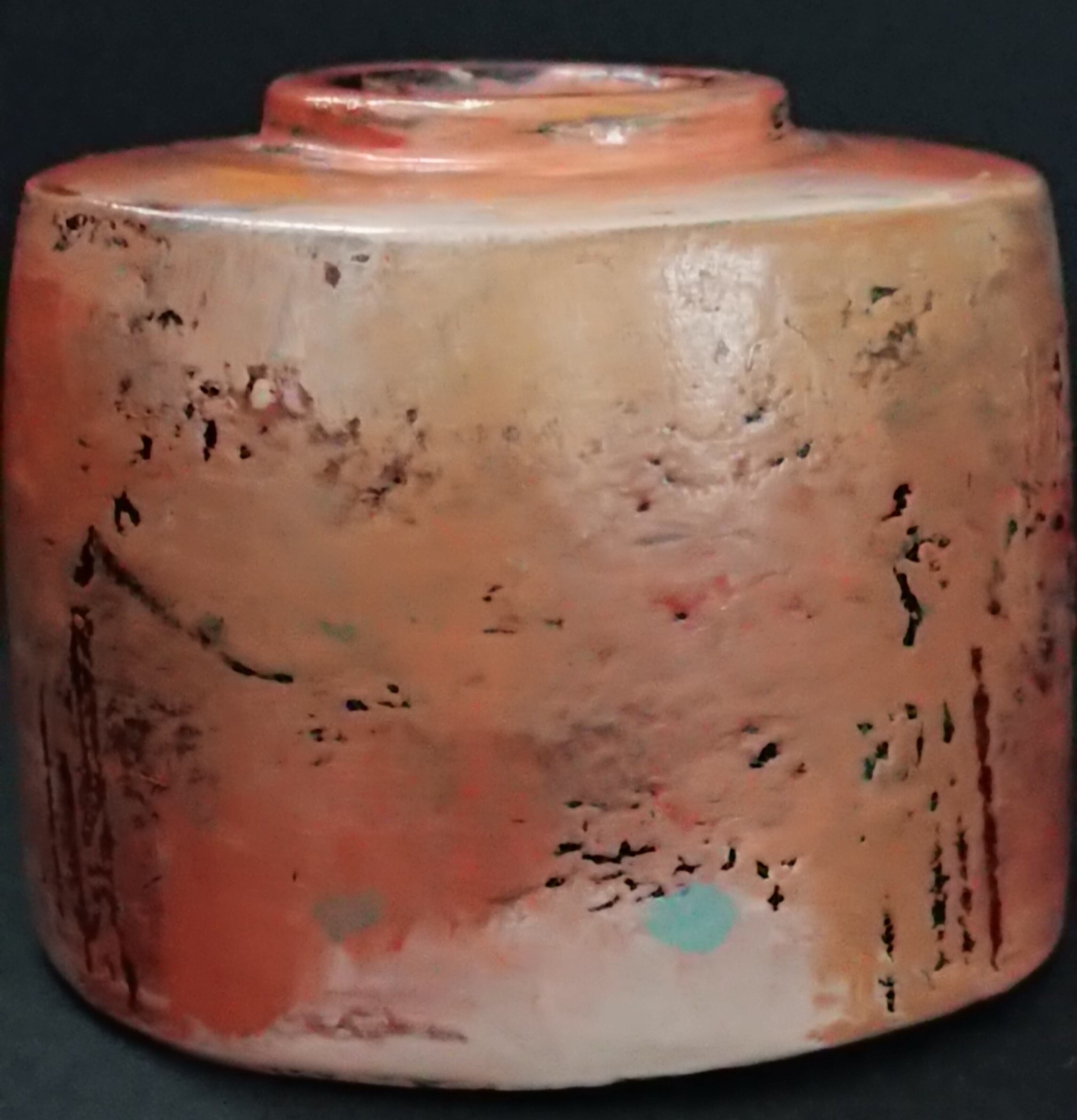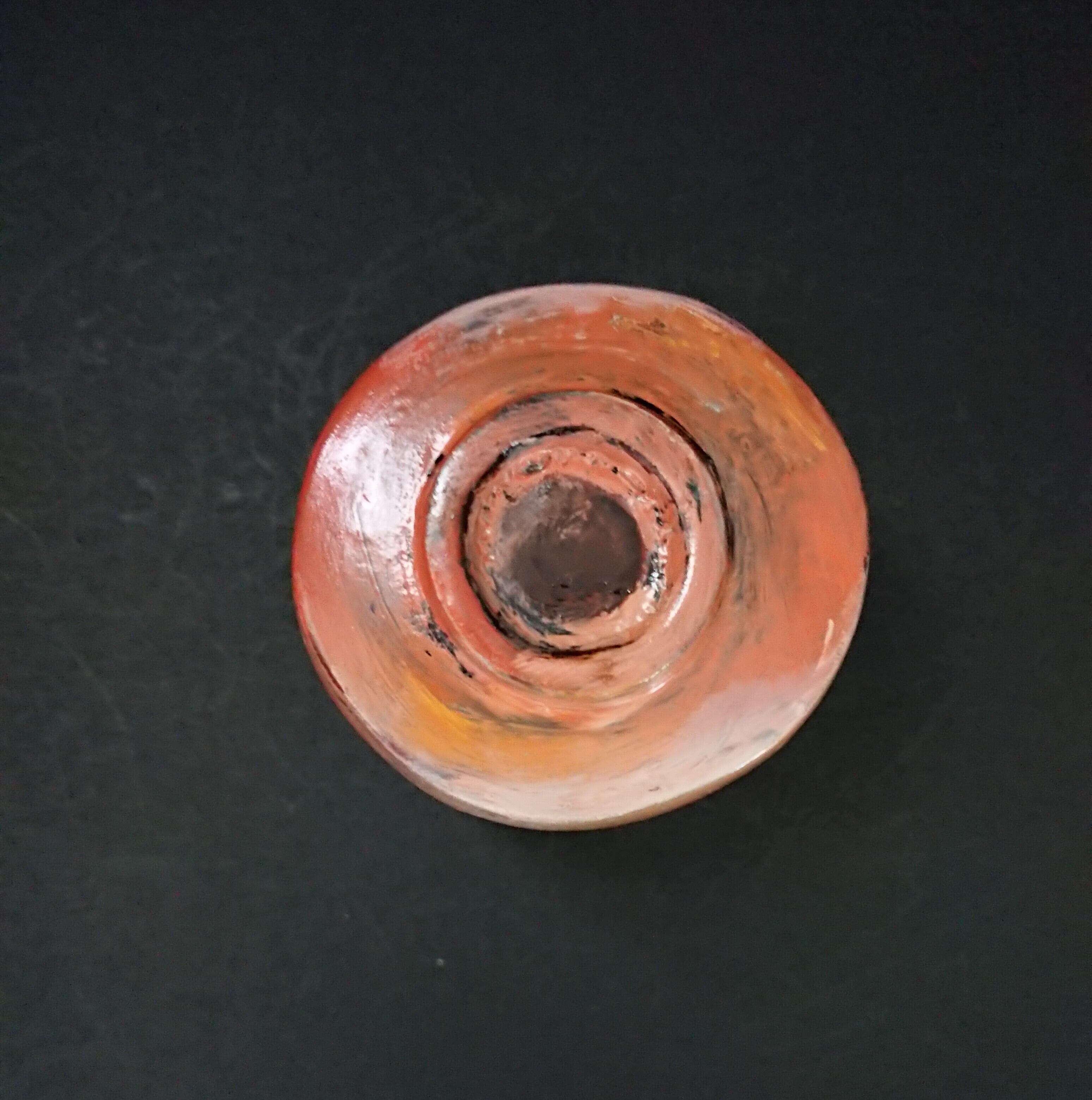 《解説》もうずいぶん前になるが、哲さんが乾漆で長次郎を想わせる茶碗をつくっているのを観て、漆でこんな面白いことができるのなら、光悦みたいなぐい呑みできませんか、と無理をいった。そういわれると俄然闘志が沸いてくるこの方の性格からして、断られるはずがないとの計算済みである。「で、どんなんがいい?」と返事を頂いたので、咄嗟に、「加賀」なんかどうですか、と応えた。この茶碗は、光悦の異形だらけの茶碗のなかでとくに飛び抜けている。それこそ作為だらけの作品で、柳宗悦からすれば、最も忌み嫌うべき茶碗の代表格だろう。その作為のひとつとして、器胎に白泥や黄土や釉薬を塗り重ねて景色をなしていることが挙げられる。どうやってこれを実現したかわからないほど、この茶碗の制作工程は謎に満ちている。ただ、少なくとも最終的な表現として複数の色彩が重なることで「加賀」の「加賀」たる所以が成立しているとすれば、この形式は、漆芸と親和性があるにちがいない。案の定、面白い作品をつくって頂いた。そのうちのひとつは筆者の手元にあるので、この作品は別の機会に作家が手掛けたものである。