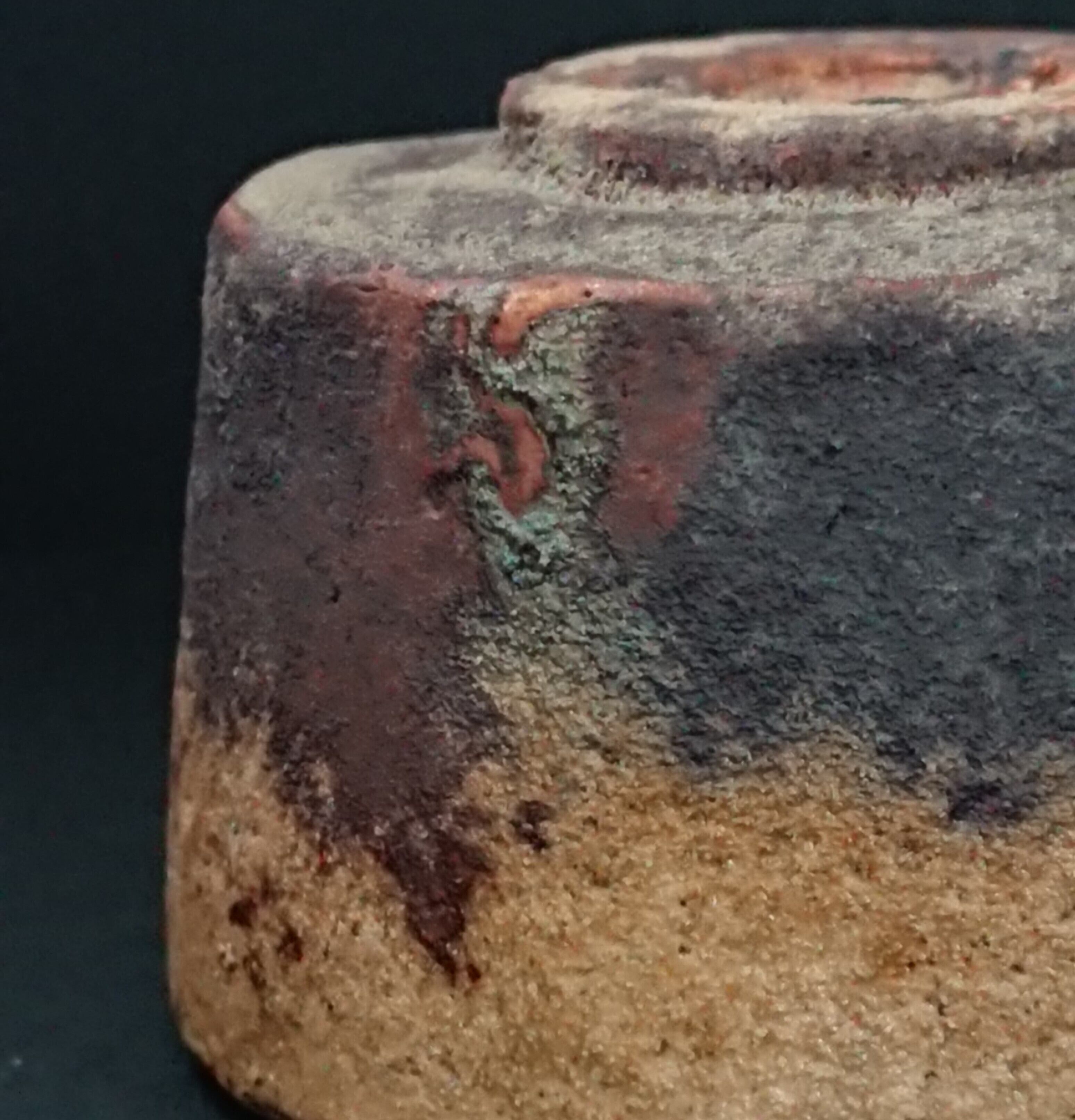 《解説》今回の企画展への参加を西岡さんに呼びかけた際、この作家が光悦にどんなアプローチをするか想像していた。織部展でまん丸の織部を出展していたから、今度もこの路線で丸い光悦を出してくるのではないか。勝手な予想は見事にハズれ、作家から届いたのは、四角い光悦、しかも黄瀬戸だった。まったく嬉しい誤算で、この作品をひとめみて、これはまちがいなく「四彩」に続く西岡さんのヒット作品になるにちがいないと確信した。「不二山」を黄瀬戸で表現するという発想は守旧派からすれば異端にみえるが、考えてみれば、本歌の下部の炭化部分は黄瀬戸のコゲとの親和性があって、素材としてこれほどピッタリな対象はない。とくに黄瀬戸の場合、胴紐や六角以外にしっくりとくる形式が極端に少ないので、これほど腑に落ちる形があったのかと驚かされた。逆に、今までなかったのが不思議なくらいだ。深い黄色、変化に富んだコゲ、とりわけ高台周辺のむらむらした感じが何ともいえない。さらに、タイトルの「不二山仰」も振るっている。