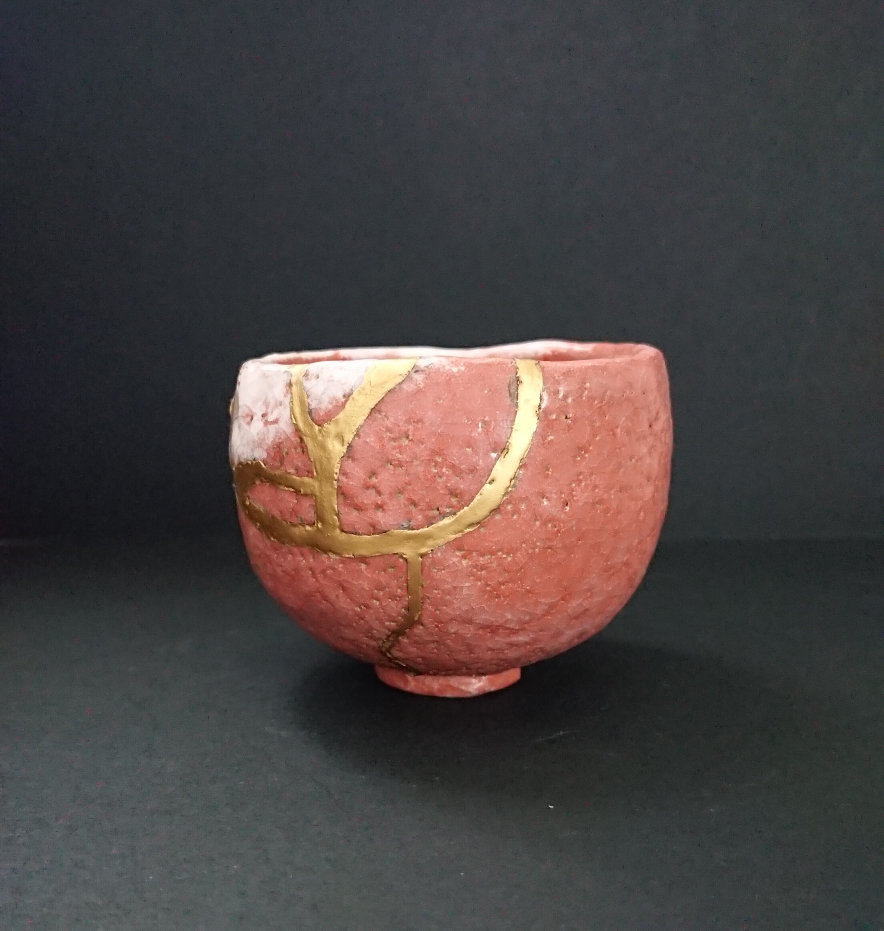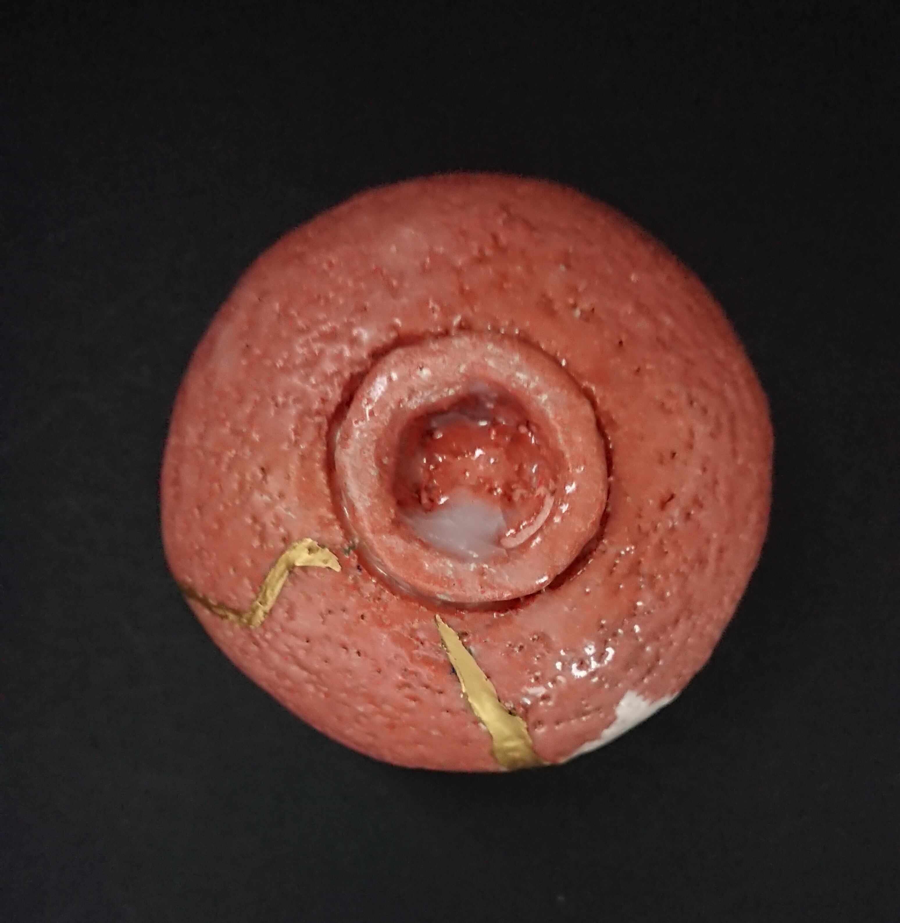 《解説》柳下さんと哲さんのコラボによる「雪峰」は、すでにここでも紹介している。織部企画のときの「須弥(十文字)」とともに、好評のうちに迎えられたが、今回、柳下さんは、もう一歩進んで、赤だけではなく、口縁から白を重ねた。本歌の白は釉薬の白濁と思っていたがどうもそうではないと踏んだようだ。確かに、こちらのほうが本歌により近いようにみえる。そこに哲さんの手が加わってどうなったかは観てのとおり。器胎の表面だけでなく、内側までも手を入れて、あいかわらず細かい仕事で納得させる。ただ、今回はアクシデントがあった。割れたとか欠けたとは違って、意図的な繕いは、繕わなければならない状態を人為的につくらねばならい。つまり、わざと壊さなければならない。今回、その過程で白い土の一部がめくれてしまった。粗い土に泥土を重ねれば無理もない事態である。哲さんはこれを金ではなくわざわざ白漆で繕った。ふつうなら欠損品といわれても仕方ないが、やきものの世界ではこれに積極的な価値をみる。本歌の金繕いがそうだし、この作品では偶然のアクシデントによって新たな見どころが生まれた。そこまでこだわって下さったおふたりに感謝しきりである。