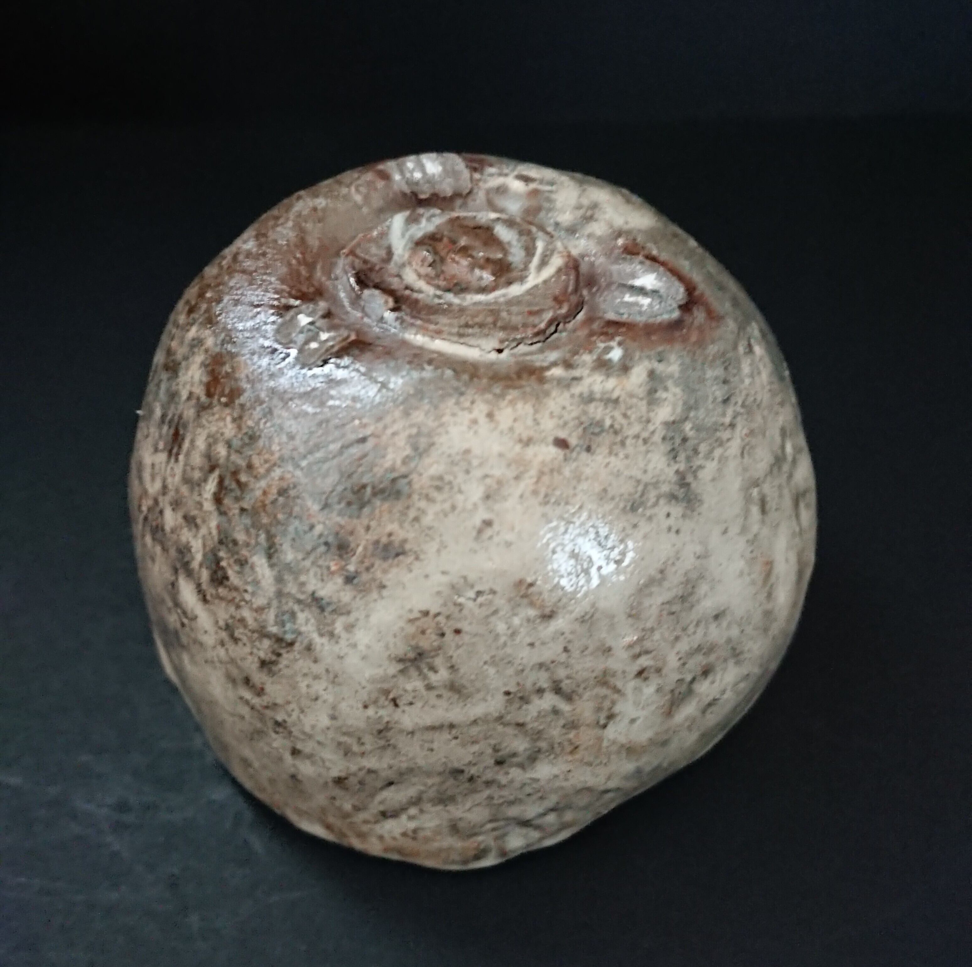 《解説》今回坂倉さんから送られてきた作品を拝見して、その完成度の高さに驚かされた。萩の土でどんな光悦が生まれるか楽しみにしていたが、光悦の手癖を的確に捉えていて、まるで本人が萩にやって来て器をつくったかのようだ。やはり彫刻をされているだけあって、対象の特徴を把握する観察力やそれを再現する造形力は確か。「本歌をそのまま再現することにはあまり意味を感じていなくて、作為と無作為の間で写せることを理想としてやってみました。」と本人はいうが、実作はどれも本歌を彷彿とさせるところからすると、作家が意識したその「作為と無作為の間」が、あるいは光悦のエッセンスを捉えているのかもしれない。さらに「つくっていて、ただただ楽しかった。」と感想を語るが、本文にも書いたように、光悦が作陶に向かう時間は楽しいものだったはずなので、これも作品に真に迫った雰囲気をもたらす一因になっているのではないか。②の作品は、①の土に萩の大道土を化粧土にして粉引にしたもの。ムラムラした土の表情とともに、口縁や胴部にニュウが入って見所となっている。