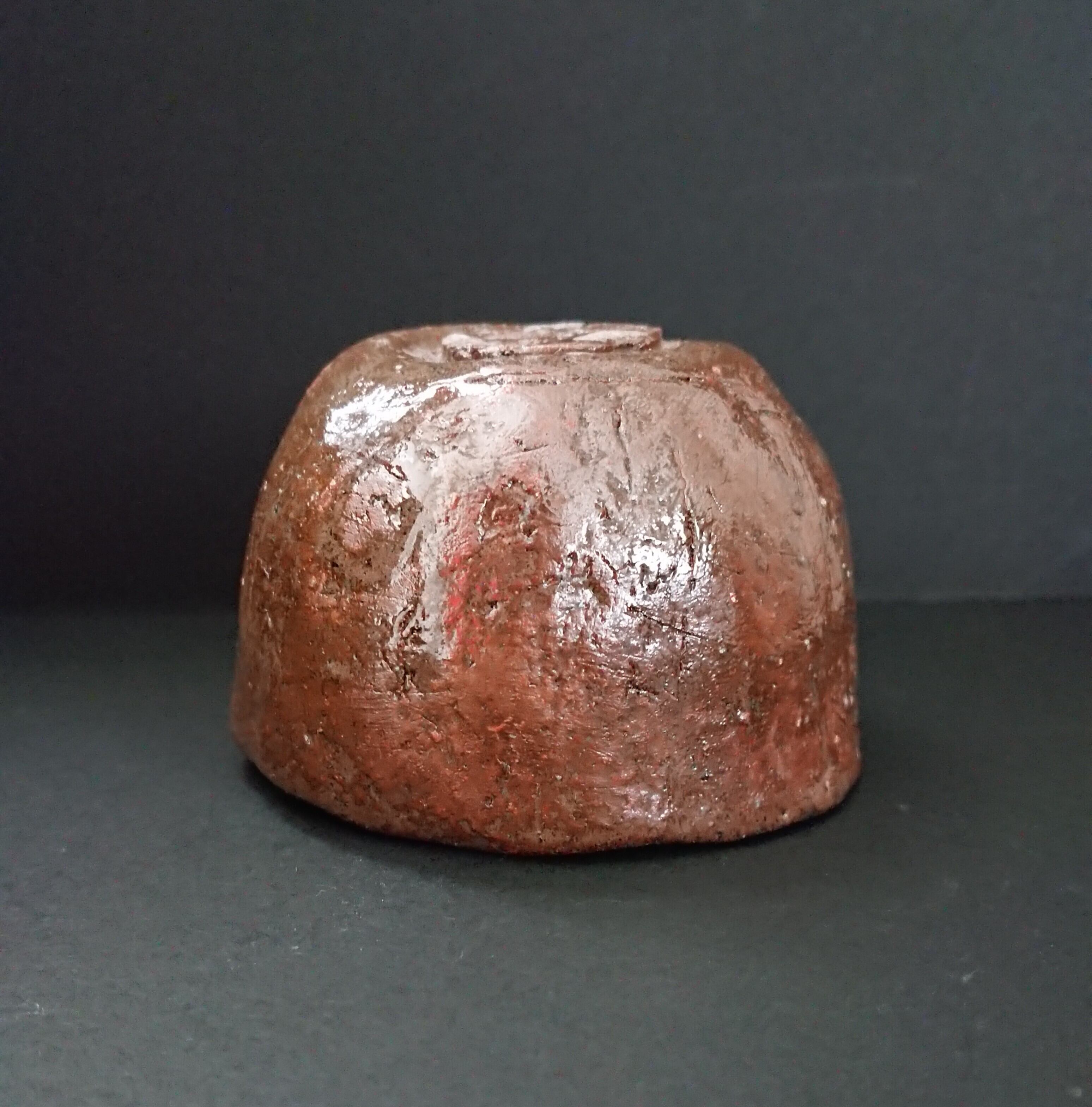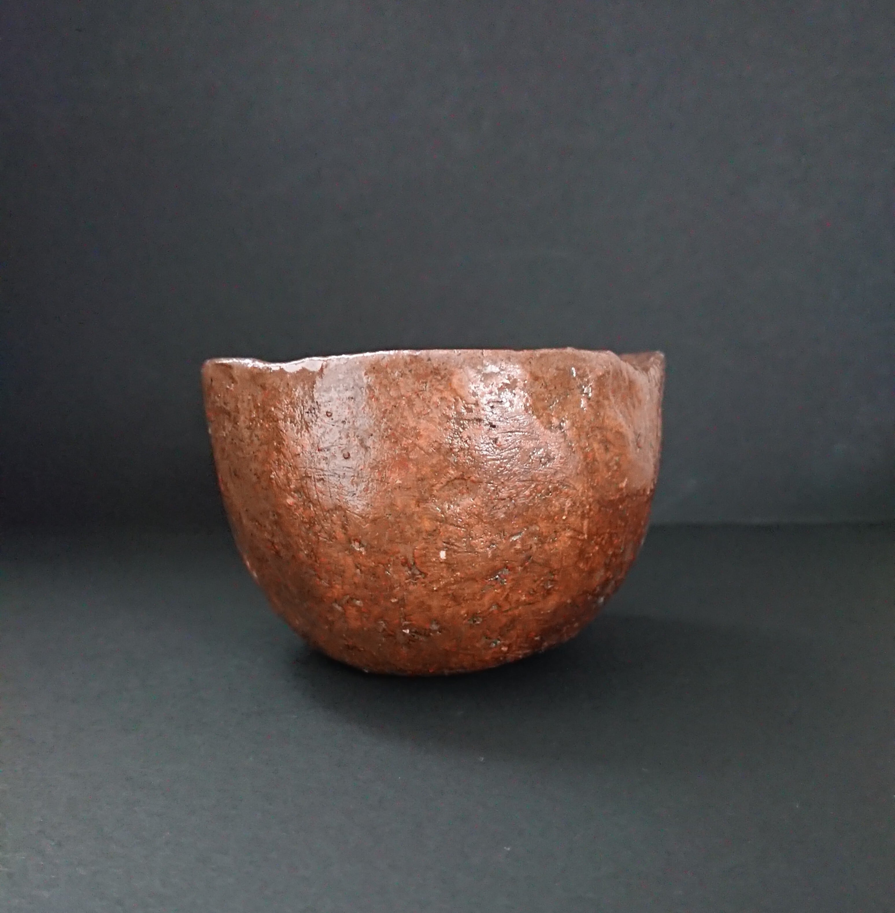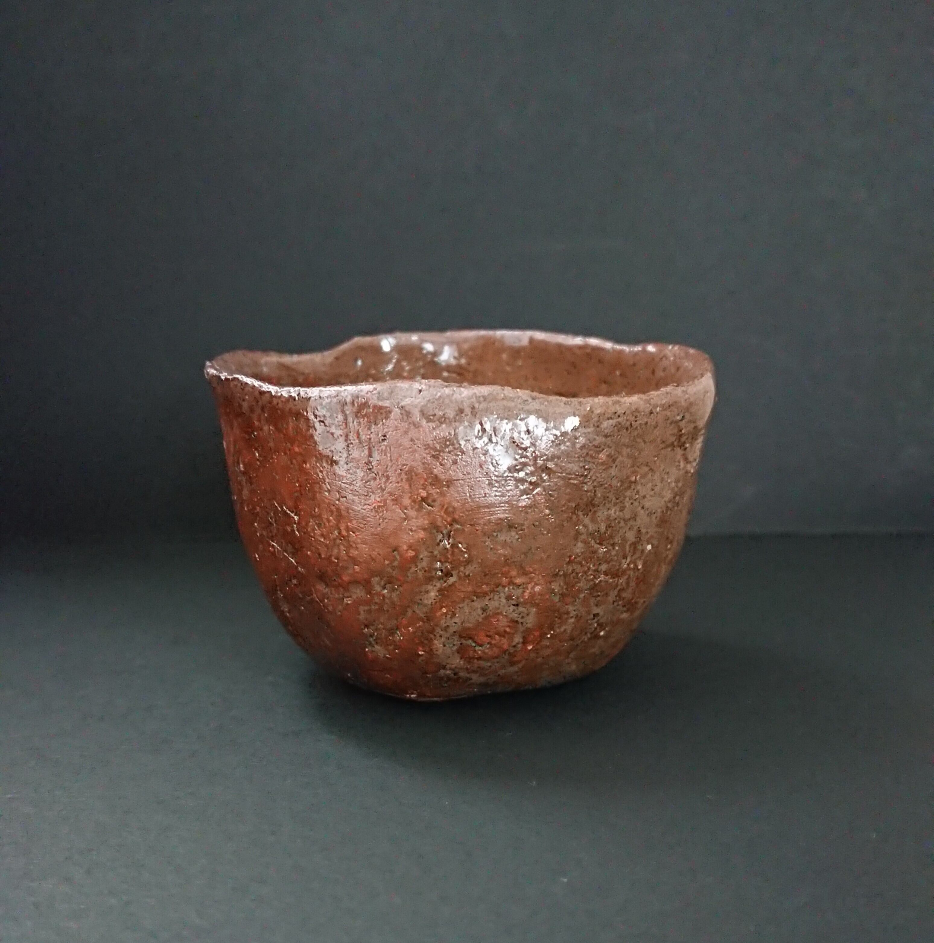 《解説》今回坂倉さんから送られてきた作品を拝見して、その完成度の高さに驚かされた。萩の土でどんな光悦が生まれるか楽しみにしていたが、光悦の手癖を的確に捉えていて、まるで本人が萩にやって来て器をつくったかのようだ。やはり彫刻をされているだけあって、対象の特徴を把握する観察力やそれを再現する造形力は確か。「本歌をそのまま再現することにはあまり意味を感じていなくて、作為と無作為の間で写せることを理想としてやってみました。」と本人はいうが、実作はどれも本歌を彷彿とさせるところからすると、作家が意識したその「作為と無作為の間」が、あるいは光悦のエッセンスを捉えているのかもしれない。さらに「つくっていて、ただただ楽しかった。」と感想を語るが、本文にも書いたように、光悦が作陶に向かう時間は楽しいものだったはずなので、これも作品に真に迫った雰囲気をもたらす一因になっているのではないか。①の作品は、坂倉さんの窯の裏山で取れる「祠(ほこら)赤土」に萩の土を混ぜて釉薬を掛けたもの。赤土のしぶい表情がそのまま表現され、胴の一部に入るヒビがアクセントになっている。