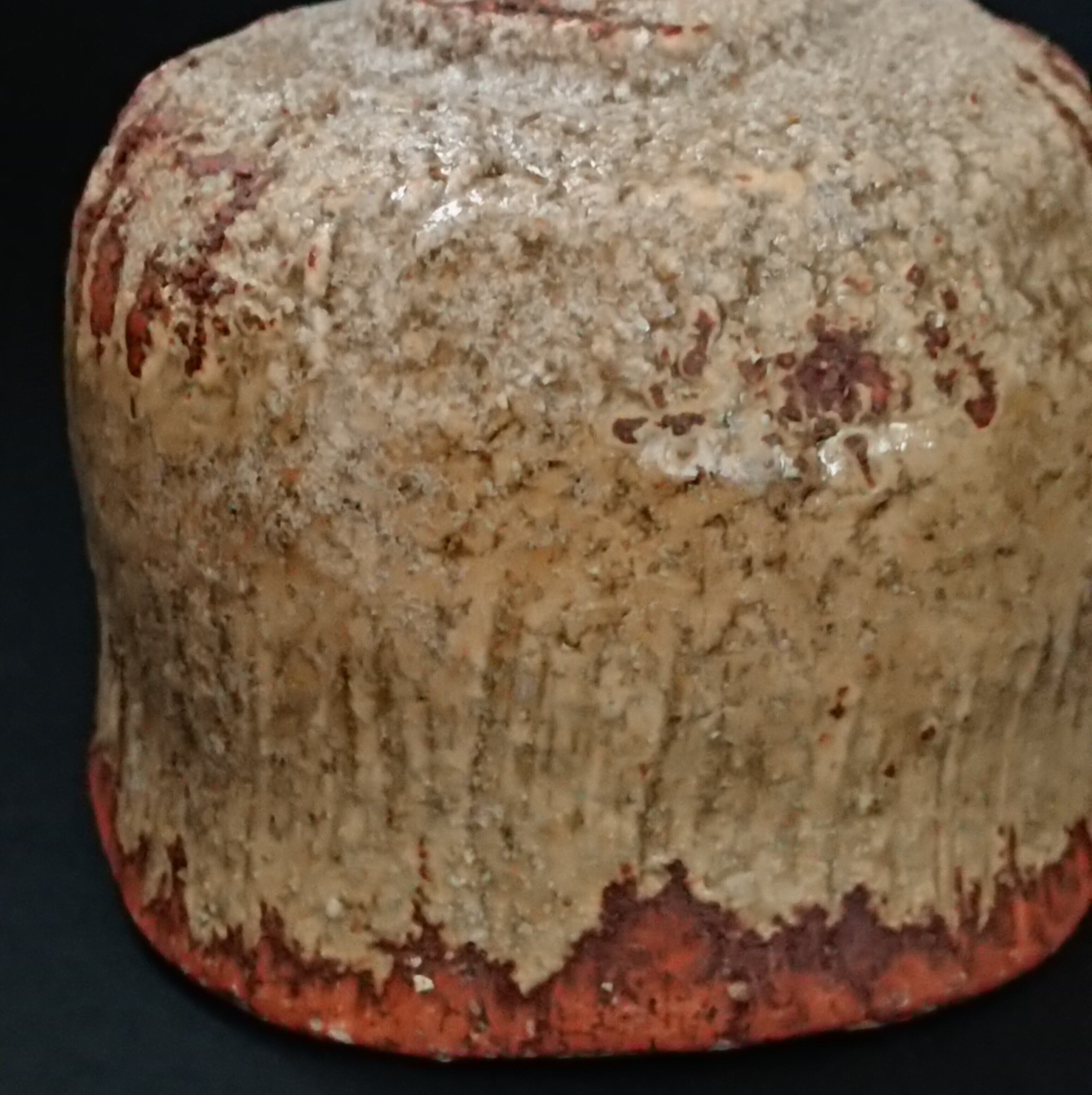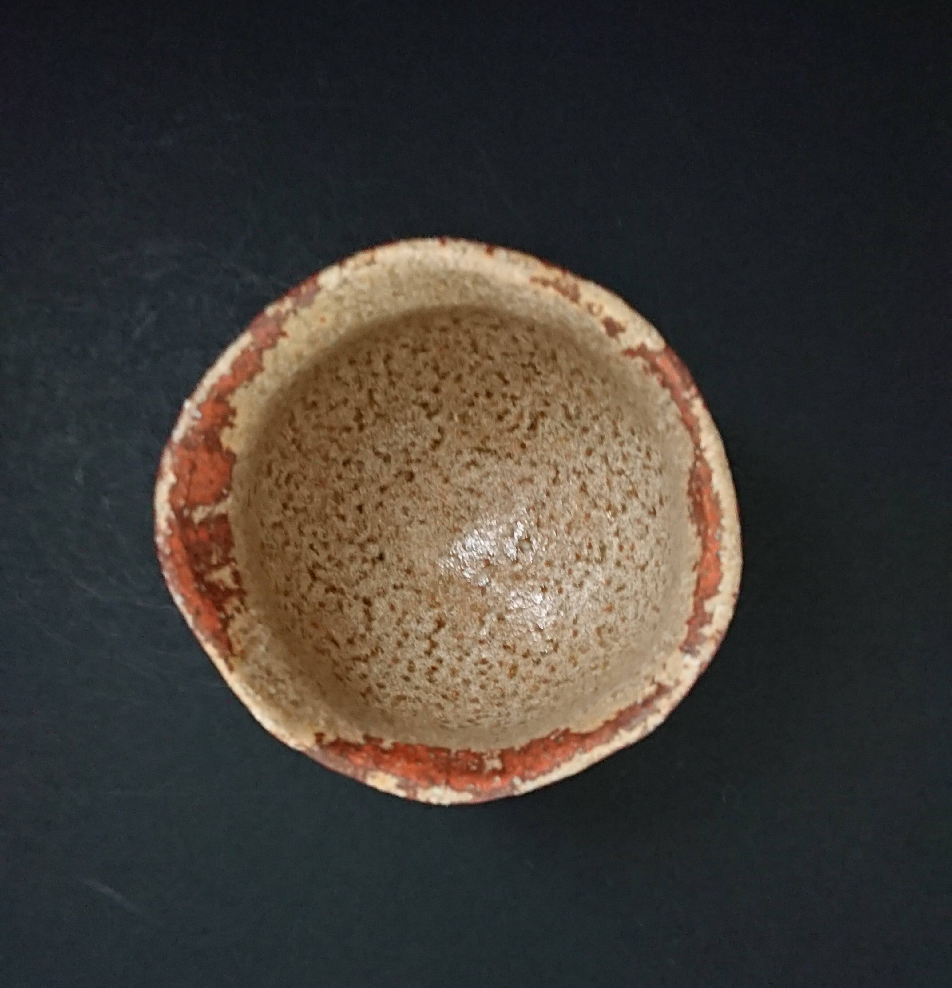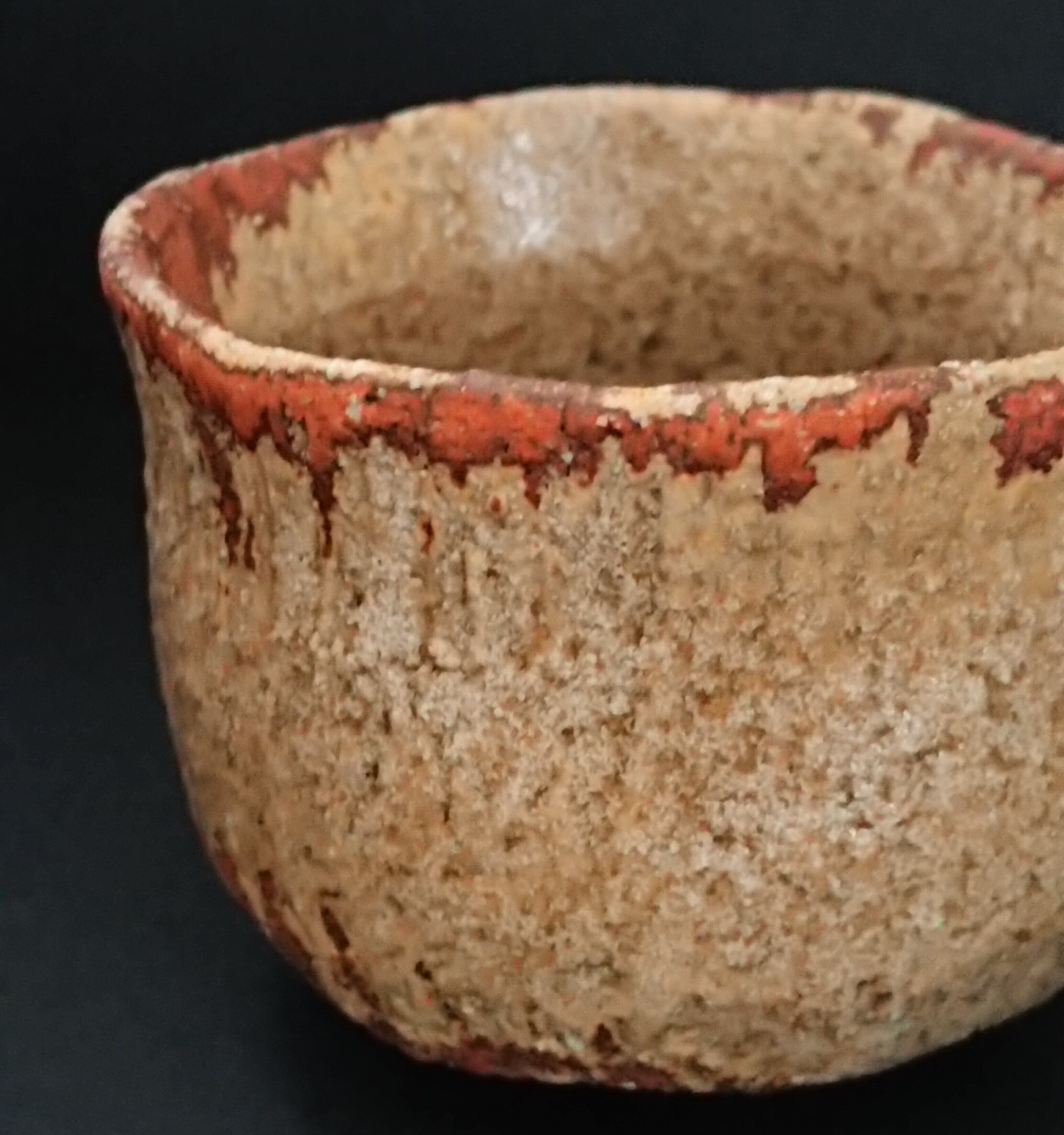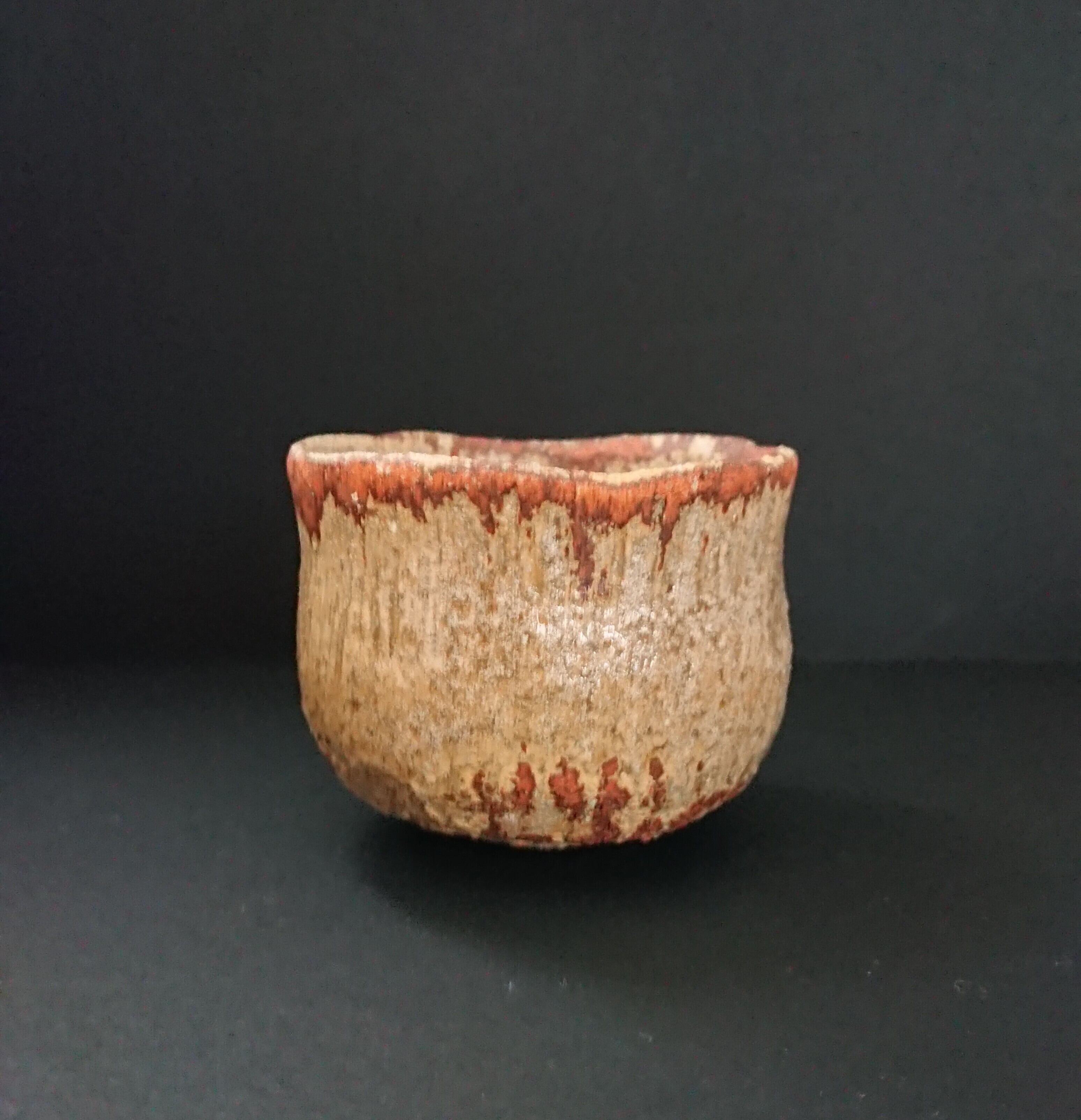 《解説》「雨雲」と黄瀬戸の組み合わせとは、意表を突かれた。本歌は、黒を基調に灰色や土肌をうまく使って墨絵のような世界を表現している。それがあかたも濃い雨雲から瀟々と雨が落ちる様子を想わせるから、この銘がついた。そのモノトーンの世界とカラフルな黄瀬戸とは、凡庸な発想からはつながりにくい。作家は、黒を黄にすることで、「雨上がりの雲間から光明が差し込む」様子に転換する。本作では、すでに雨は止んでいて、その替わりに雲間から差し込む光で辺りが明るくなりはじめている。本歌を知る者は、この作品を通して、「雨雲」から「雨上がり」へと経過していく時間そのものを体験することができる。もともと「雨雲」は作家にとって「造形的に尽くされた」茶碗として驚嘆の的だったという。そして、その釉薬と土肌のコントラストが、黄瀬戸の「じんわりした肌と焦げ」のそれを表現するのにぴったりだったとのこと。いかに光悦といえども、自分の作品が後の世でこんな形に生まれ変わるなど思いも及ばなかったことだろう。光悦と黄瀬戸とのきわめてユニークな「新結合」である。