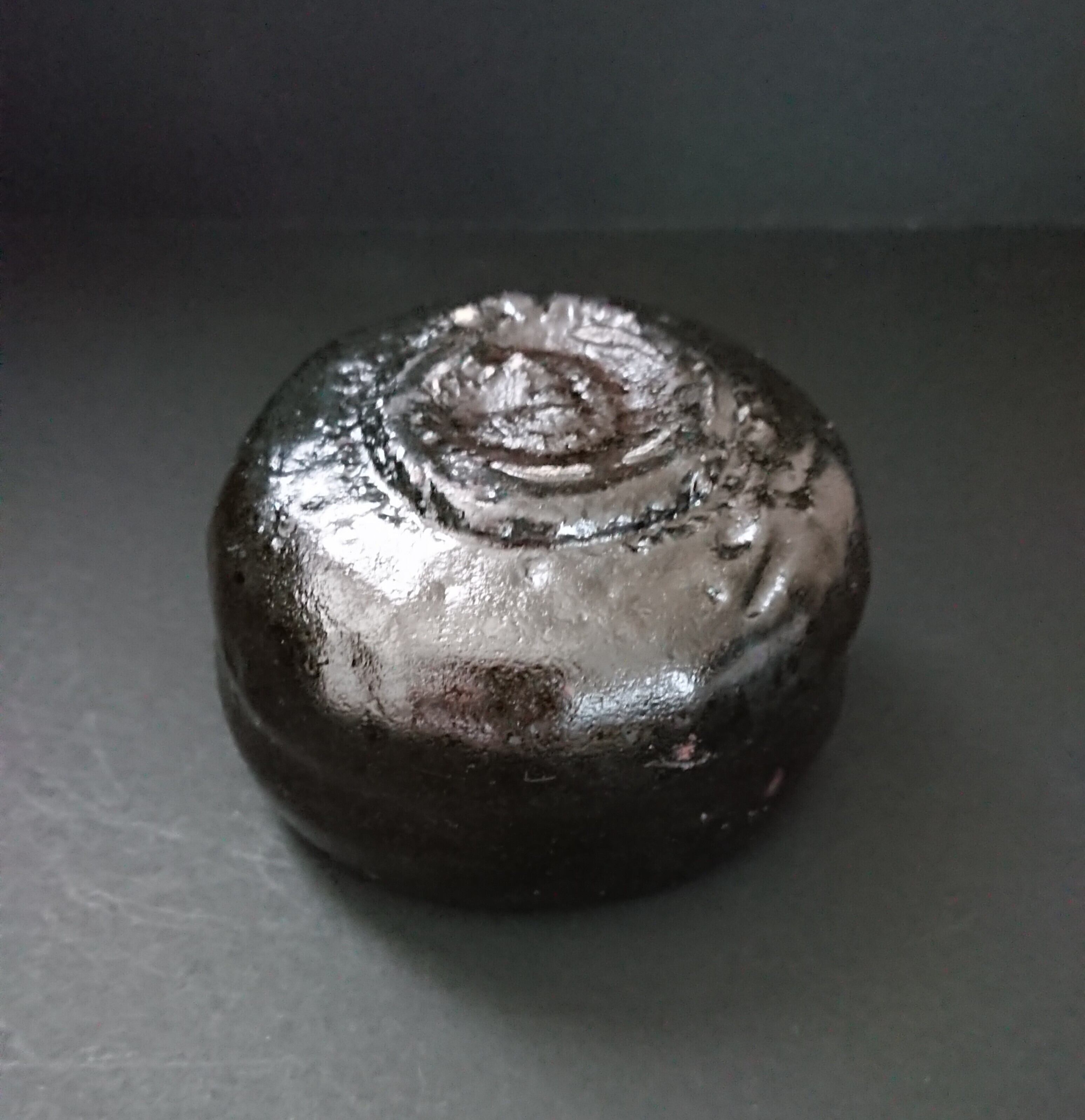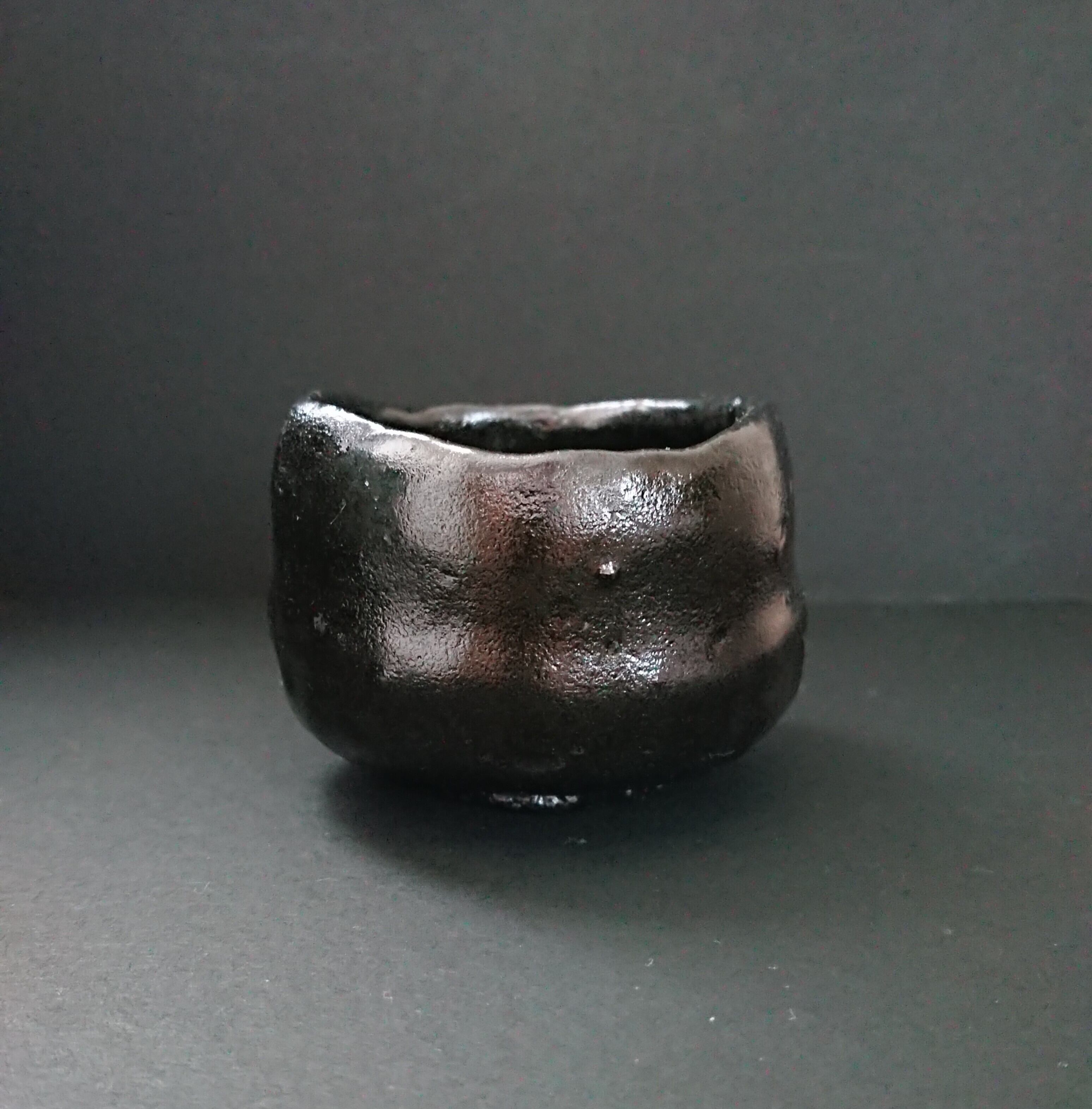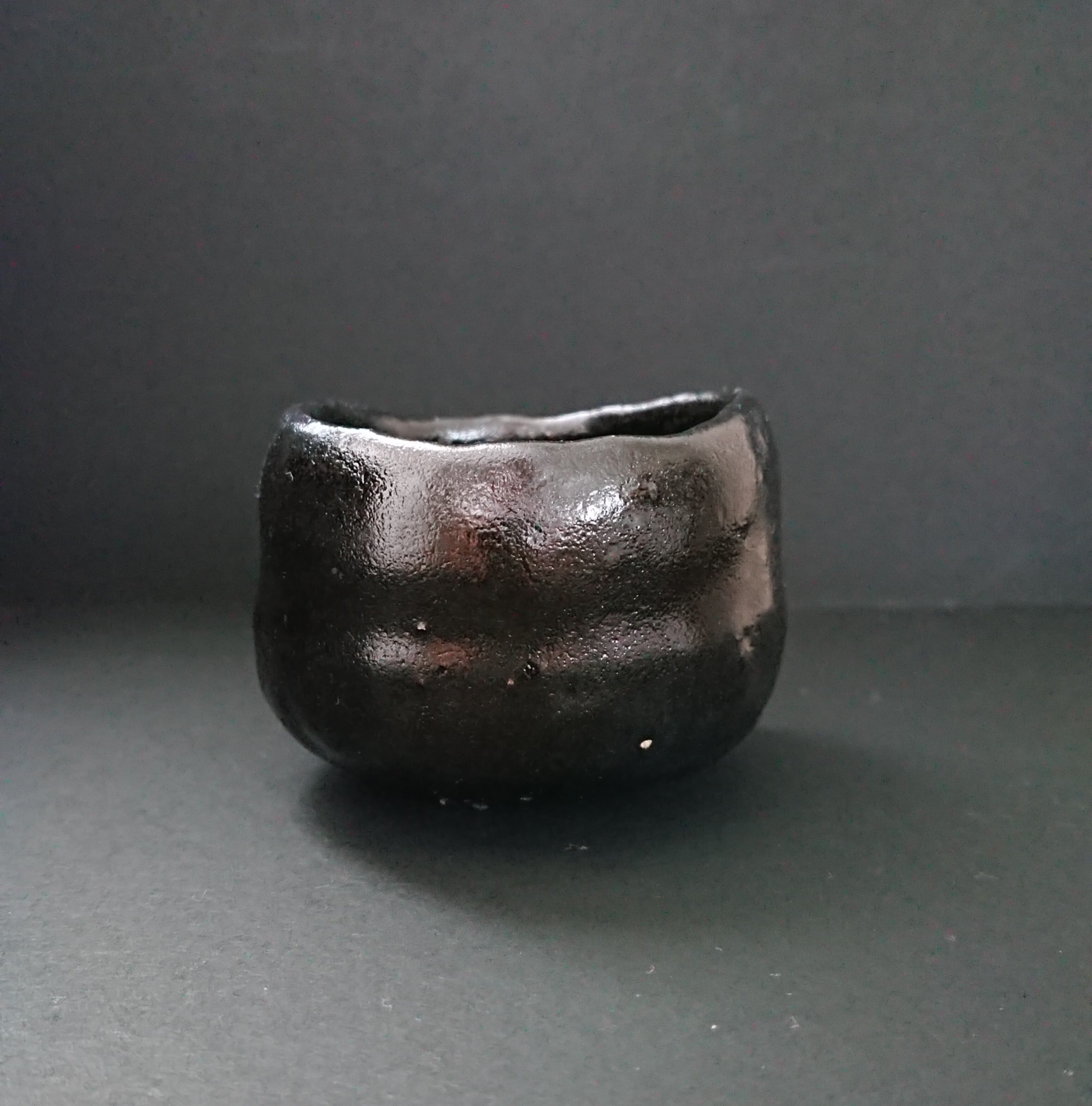 《解説》本文にも書いたように、光悦作品には丸みを帯びたものと角張ったものがある。都さんから送られてきたこの作品を箱から取り出すとき、包み紙の向こうの感触で、これは丸いほうだなとすぐにわかった。包みを解いてみると、案の定丸かったが、光悦の特定の作品を連想させるものではなかった。作家は「特定作品の写しは意識せずに、美濃物とは異質な「向勢」の作行きを手捻りで試した」という。「向勢」は書道用語で字の縦の線を左右横にふくらませる書き方をいう。本文で第三タイプに分類した「乙御前」や「紙屋」などは、まさに「向勢」の作行きからなっていて、作家はこれを光悦のエッセンスと解釈したようだ。光悦のどの作品とも似ていないが、その丸みには確かに光悦の造形がなぞられている。今回唯一の「黒」となったが、瀬戸黒の引き出しの技法と楽の手捻りと「向勢」が作家を起点に「新結合」をもたらした。光悦を「主体的に作品として茶碗をつくった初めての個人作家」とみなす都さん。同じ作家としてこの巨人と対峙した痕跡がひしと感じられる黒である。