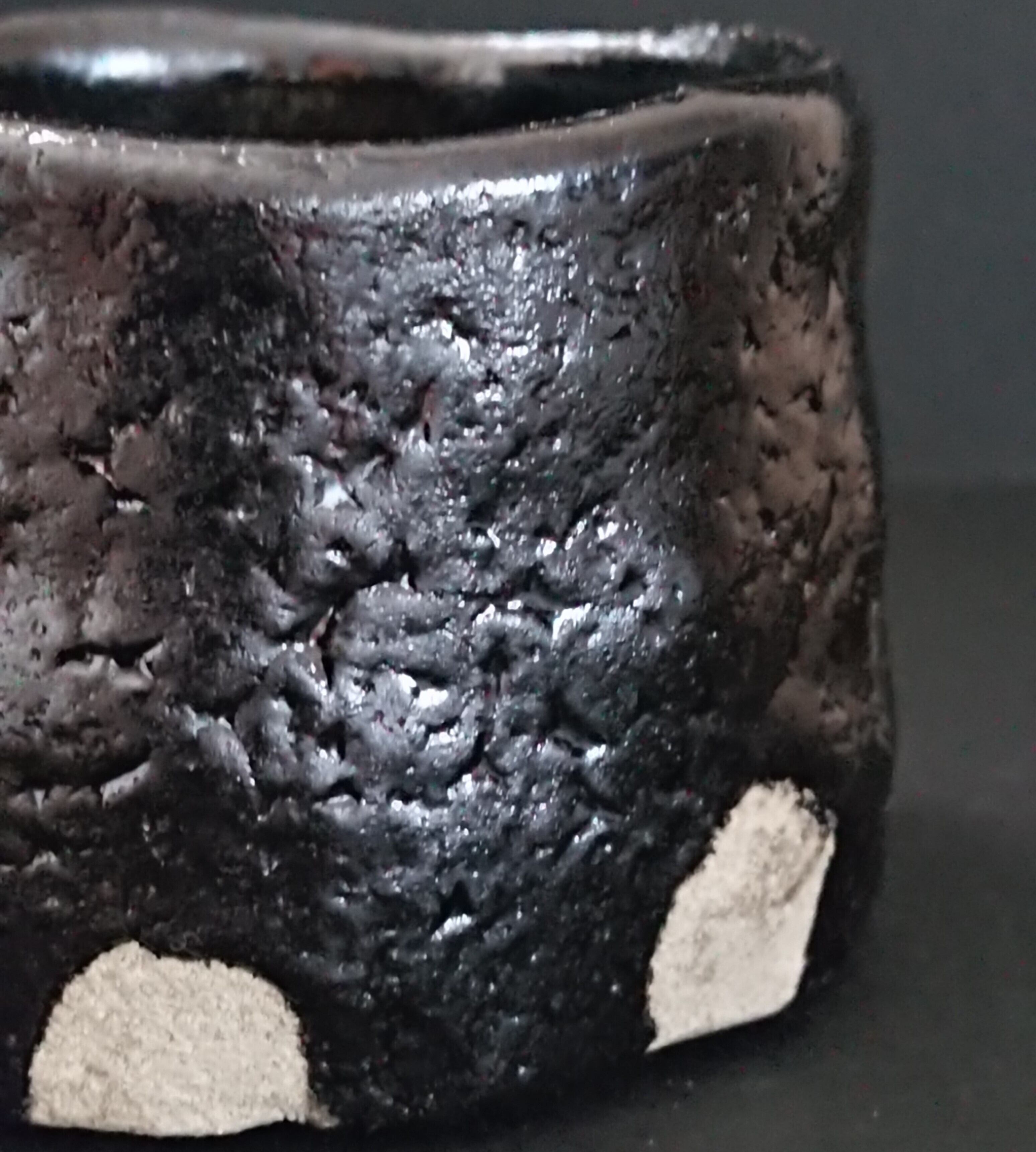 《解説》瀬戸黒については、独断的な思い込みが強い分、もともと挟隘な射程がさらに狭くなる。ブログでも書いたが、まずその形式を踏んでいないものはダメ。そして、最近大勢になっている釉薬が縮れ状になっているものも「何だこりゃ?」と首を傾げたくなる。井戸の梅花皮(かいらぎ)を出すのがさして難しくないように、瀬戸黒の表面をゴツゴツさせるのに技術的な優位性があるとも思えない。それをこれみよがしに作品化しているのをみると、しかもそんな作品が多いだけに、ほとほとうんざりする。それが瀬戸黒の可能性を矮小化する現在の傾向であるのは実に嘆かわしい。深見さんのこの作品は、ブログでも書いたように形式という芯棒がしっかり通っているし、何よりその漆黒の釉肌がすこぶるいい。基本、素直で穏やかな黒が広がるなか、おぼろげにそれが収縮して変化が見え隠れする。そこには、これみよがしのわざとらしさは微塵もない。作家は瀬戸黒のゴツゴツとした形式を理解している。だが、それをナイーブにゴツゴツとではなく、いたって繊細に表現している。