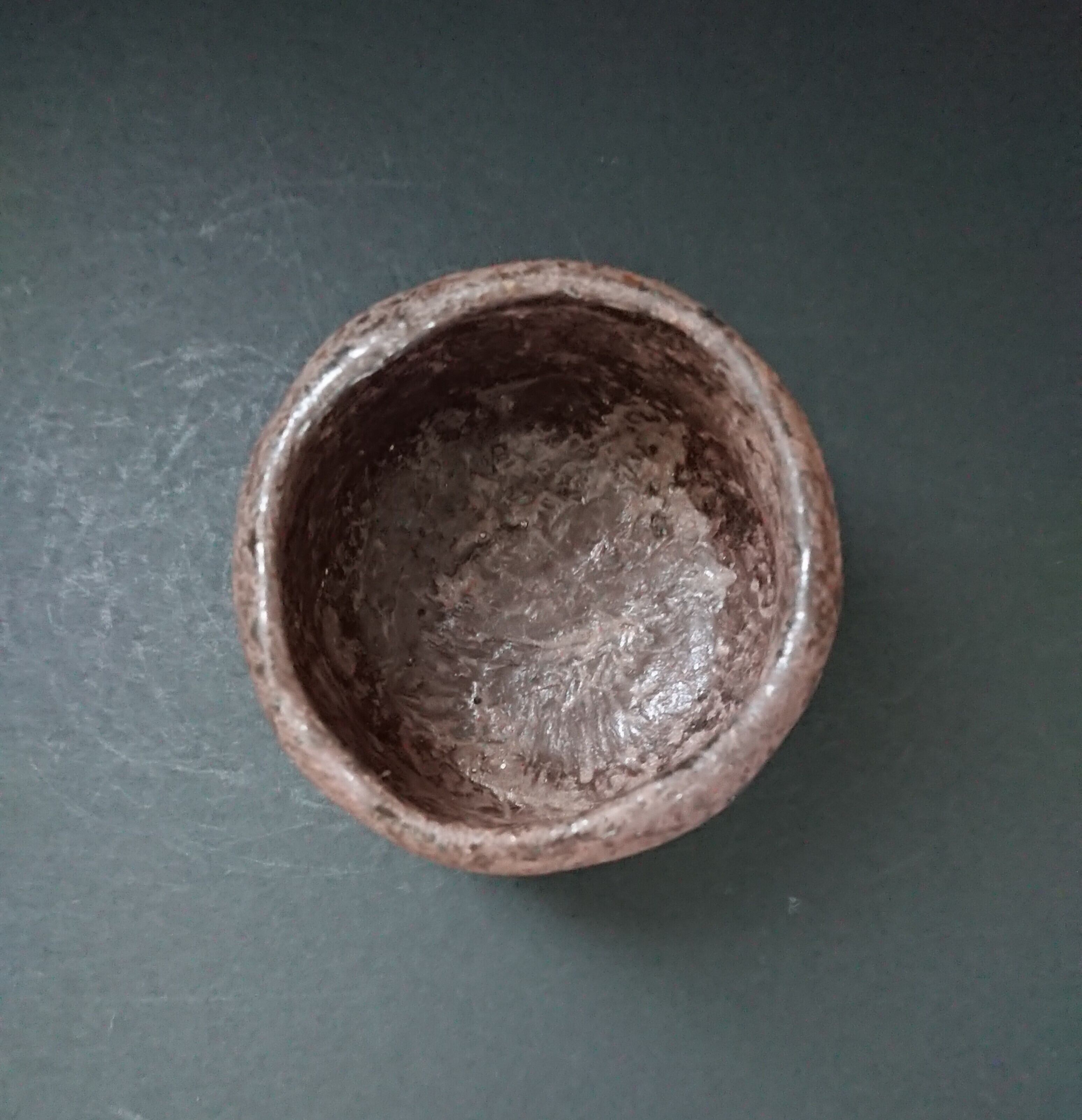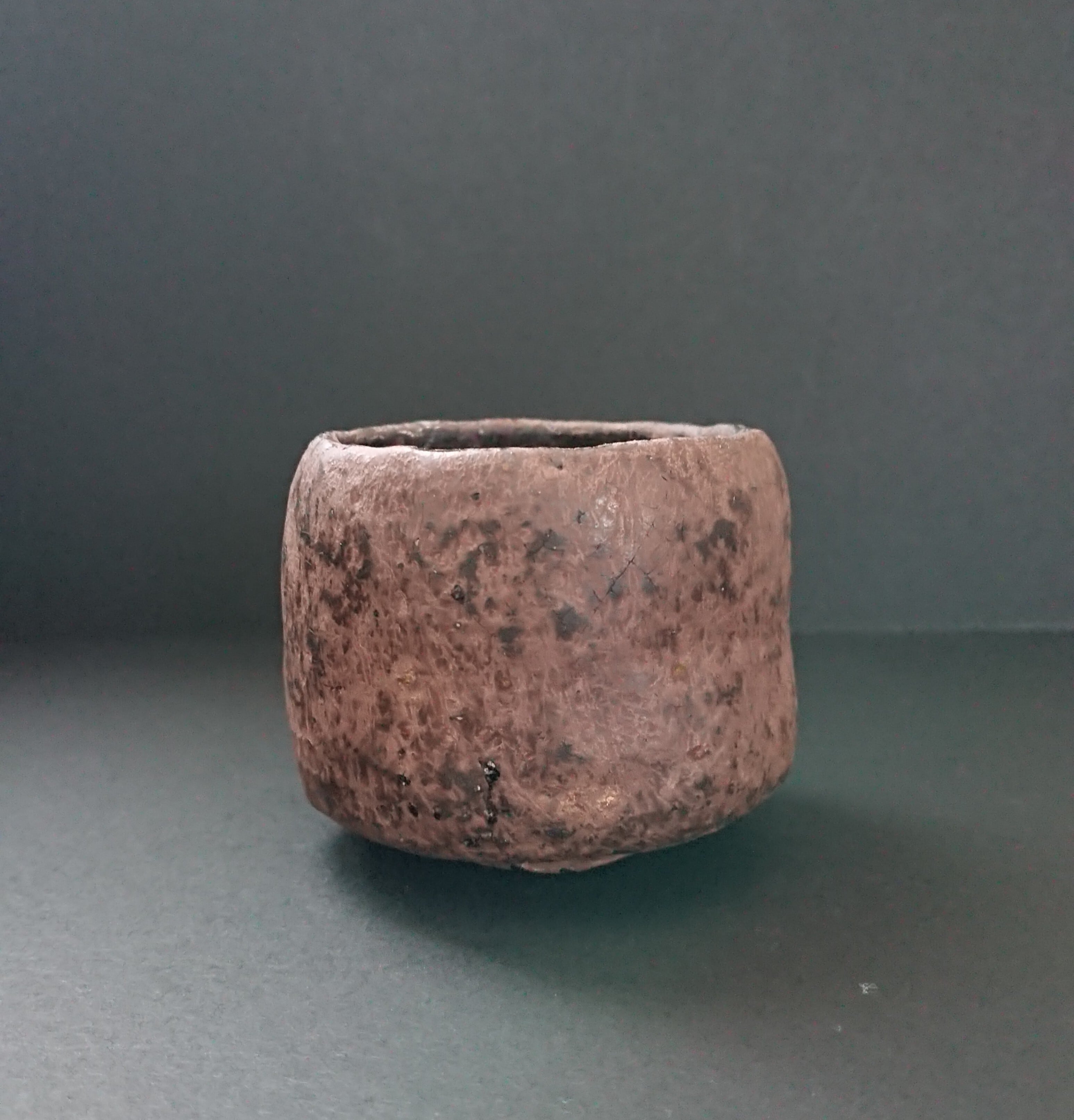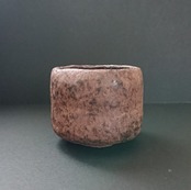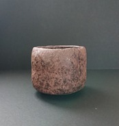 《解説》柳下さんが「黒」をリニューアルして、師匠の杉本(貞光)師にみせにいったら、これまでになく褒められたという話は、インタビュー本文に載せた。ちょうどそれがインタビューをした日の前日のことだったそうだが。これにはまた後日談がある。杉本師は、この「今焼黒」がよほど気に入られたようで、その後、柳下さんのところへ何回か観にこられたそうだ。「もしかしたら長次郎よりいいかもしれない。」とまでおっしゃられたようで、この「黒」に惹かれた度合がよくわかる。その言葉には、柳下さんが自分の作陶の目的を、長次郎を単に真似るのではなく、その本質をとらえることだと訴えるのとシンクロナイズしている。長次郎茶碗の向こうにある長次郎的な本質を、桃山陶の向こうにある桃山的なものを追求する。それが、師である杉本師とともに、柳下さんが実践する作陶にほかならない。写真は長次郎黒のざわざわ感がわかるように少し明るめの光にあてて撮っている。茶室のような薄暗い空間におけば、対照的に幽玄な姿をみせる。表現域の広い作品である。
