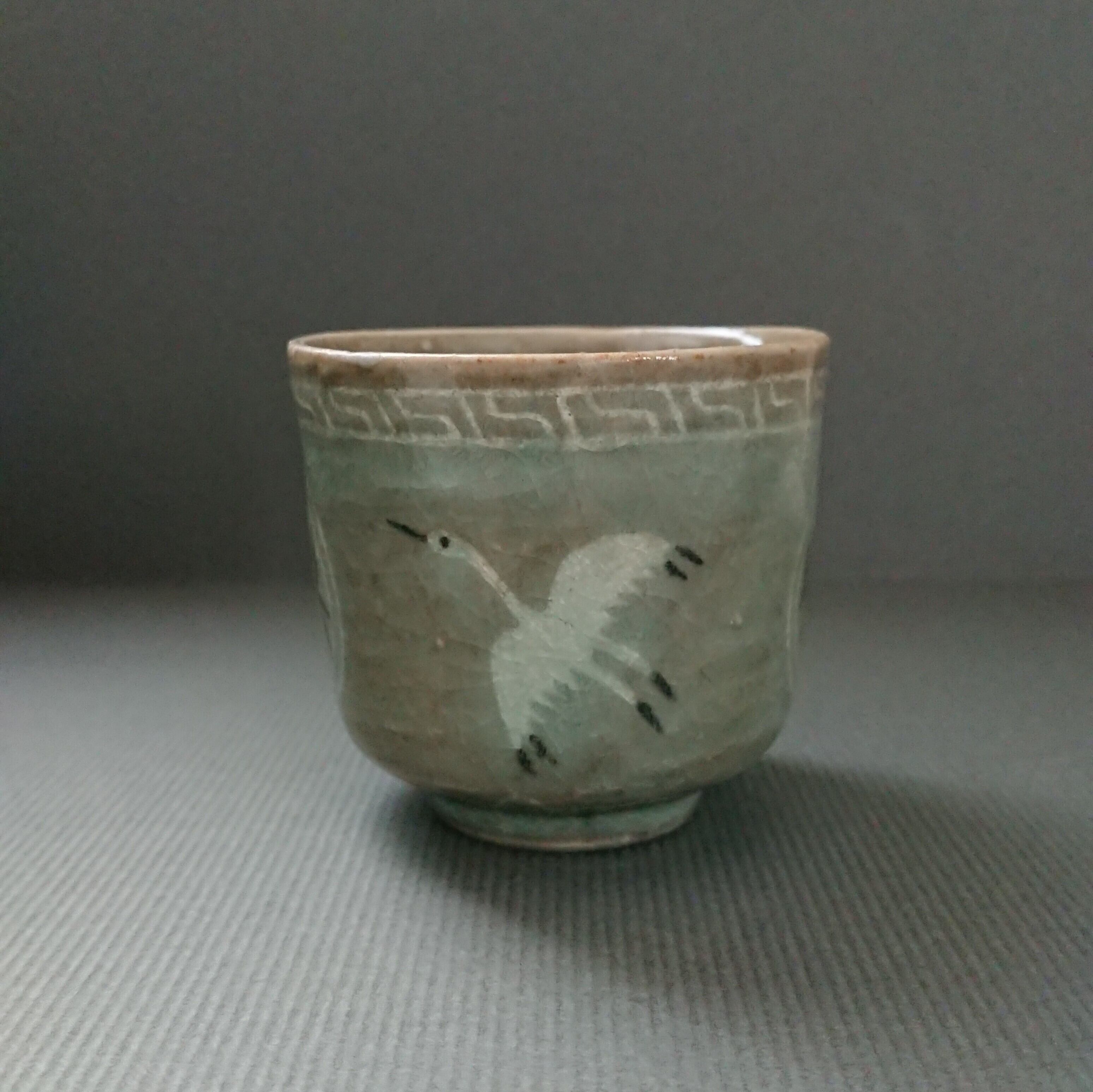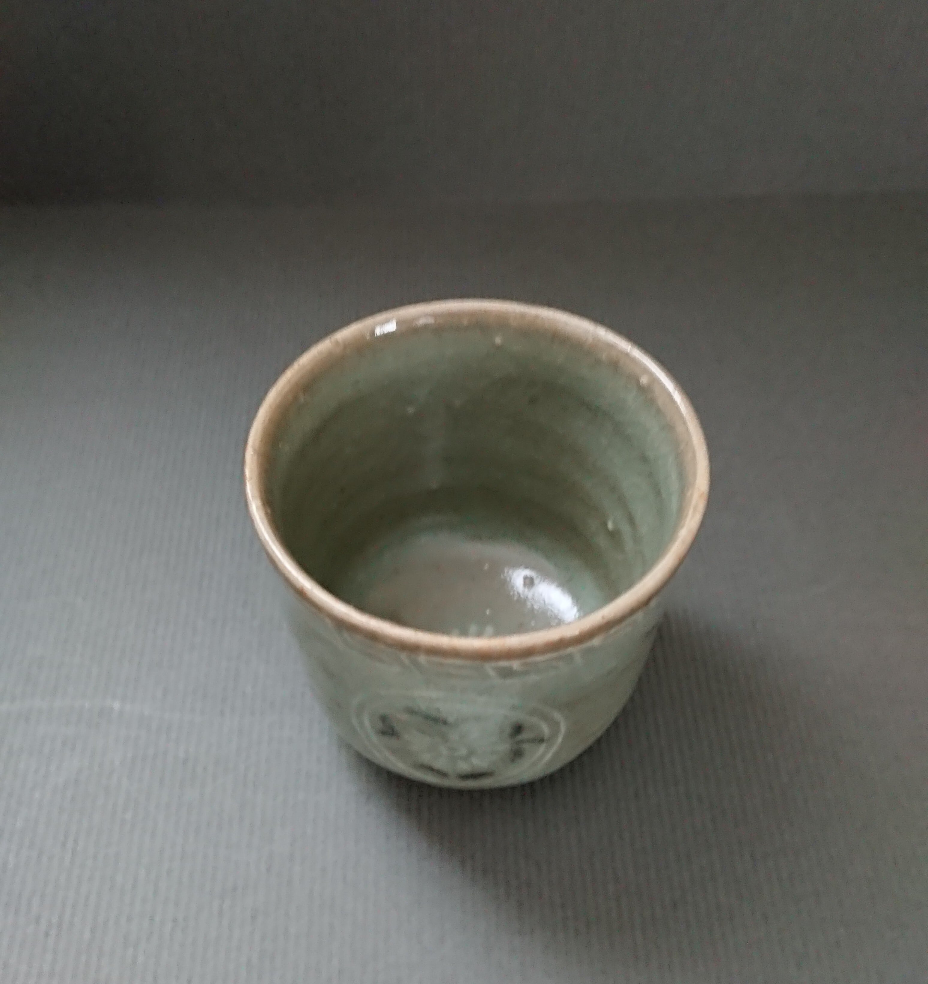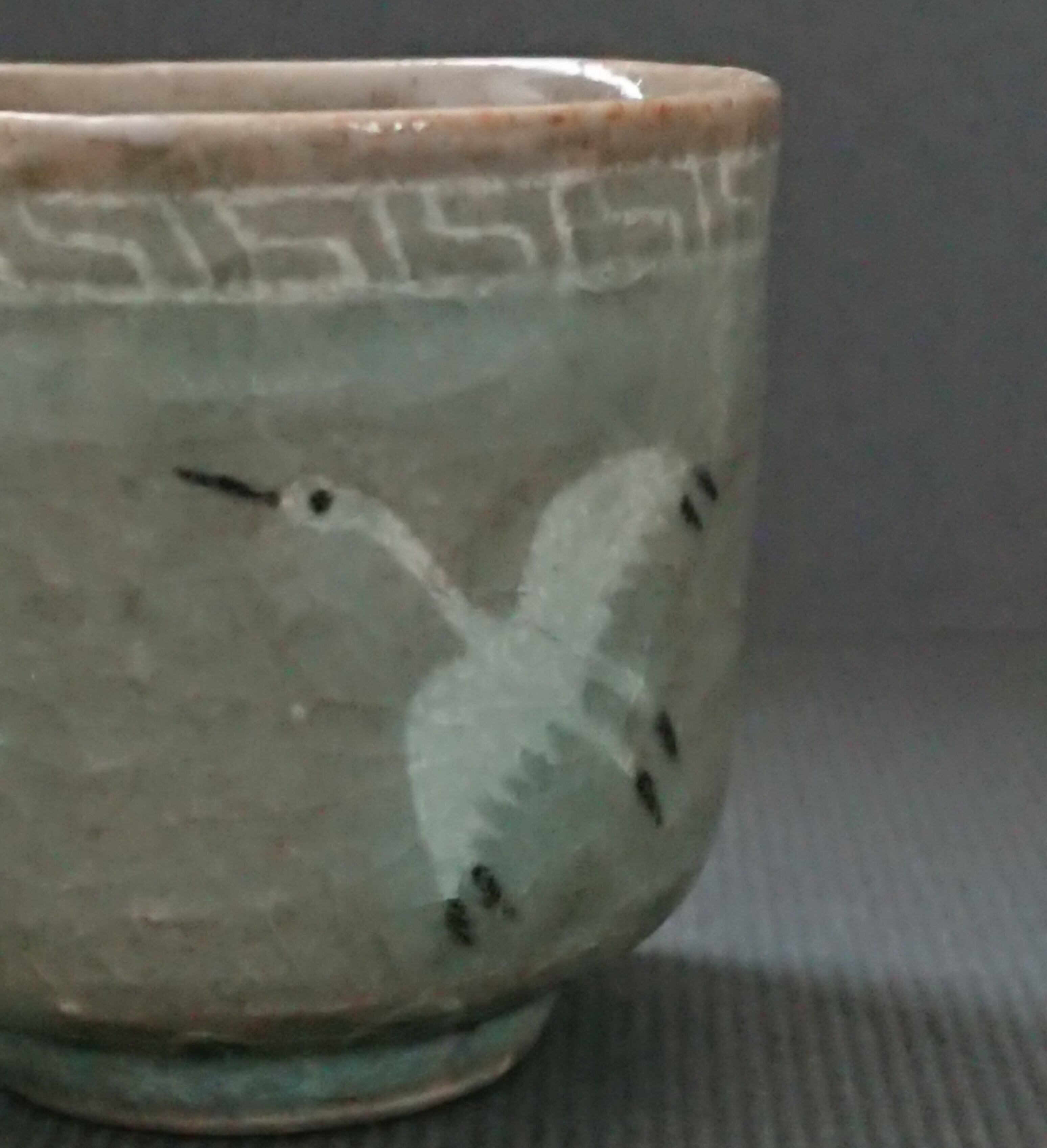 《解説》晩年の利休が愛用した「挽木鞘」をモデルにした作品。高麗青磁の筒茶碗で、胴中程の文様が狂言役者の袴の文様に似ることから一般に狂言袴茶碗と呼ばれる。「挽木鞘」が茶会記に現れるのは利休自刃のわずか三か月前だが、それから死ぬまでの間にかなりの頻度で使用されているところからすると、相当の思い入れがあったと推測できる。堺に蟄居を命じられてからこの茶碗を細川忠興に送ったエピソードはよく知られている。腰の張った筒形は利休がとくに好んだ造形で、長次郎茶碗には当たり前にみられるし、高麗物では他に「三島桶」が好みの茶碗として伝わっている。古松さんは、これを立ちぐい様式にアレンジして、本歌以上に美しく仕上げた。キラキラの青磁でもない、かといって粉青まで濁らない、深く沈静した青は観る者の心にじわりと染み入る。口縁や高台周辺にほのかにさす火色もアクセントになっていていい。利休の魅力を表現するについて、古松さんの作品は欠かせないと身勝手なお願いをしたところ、今回快く御協力頂いた。利休の愛した茶碗の魅力を今によみがえらせてくれているのはもちろん、それだけにとどまらない高麗青磁の稀少な美しさを、この作品は訴えている。