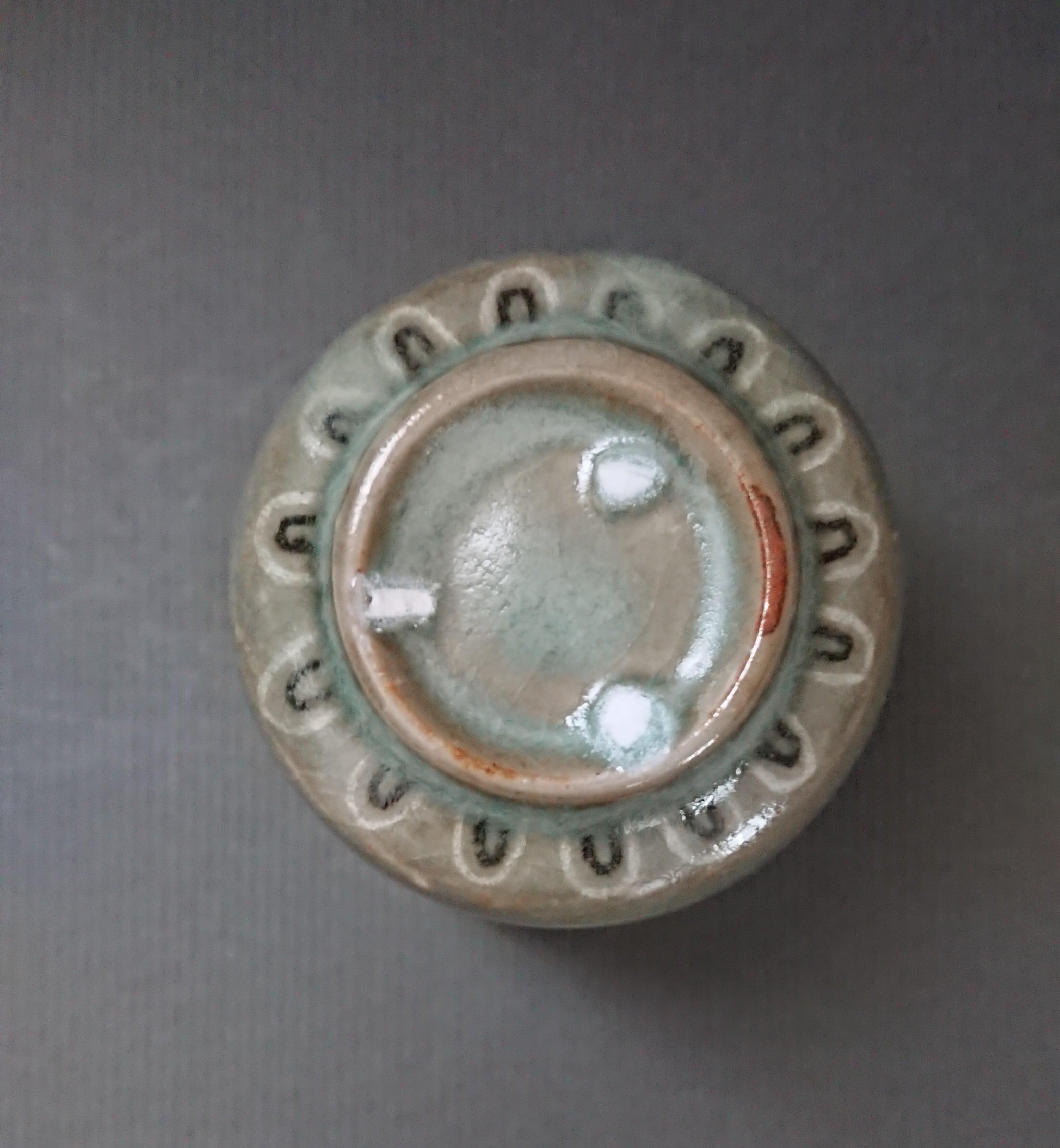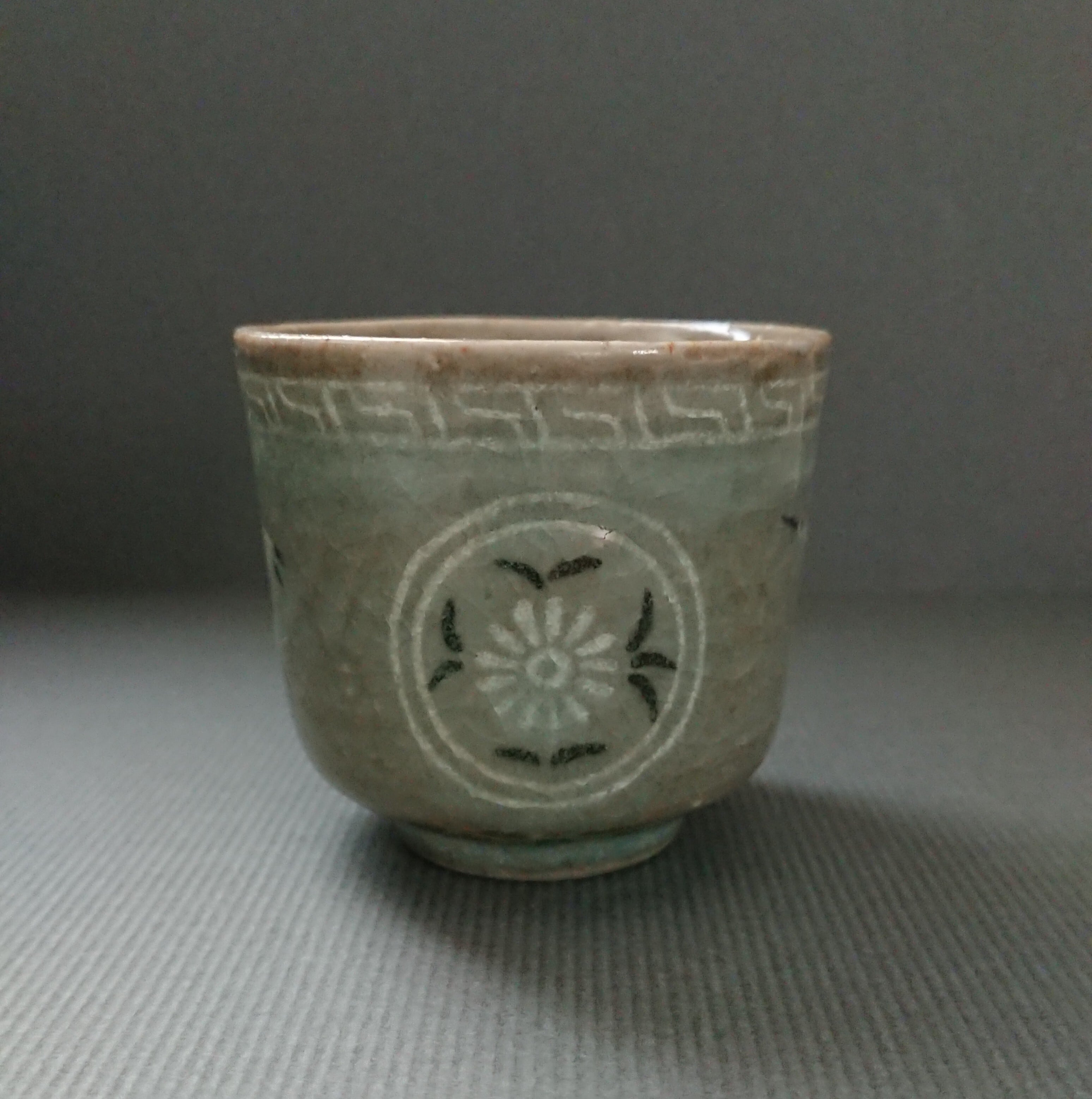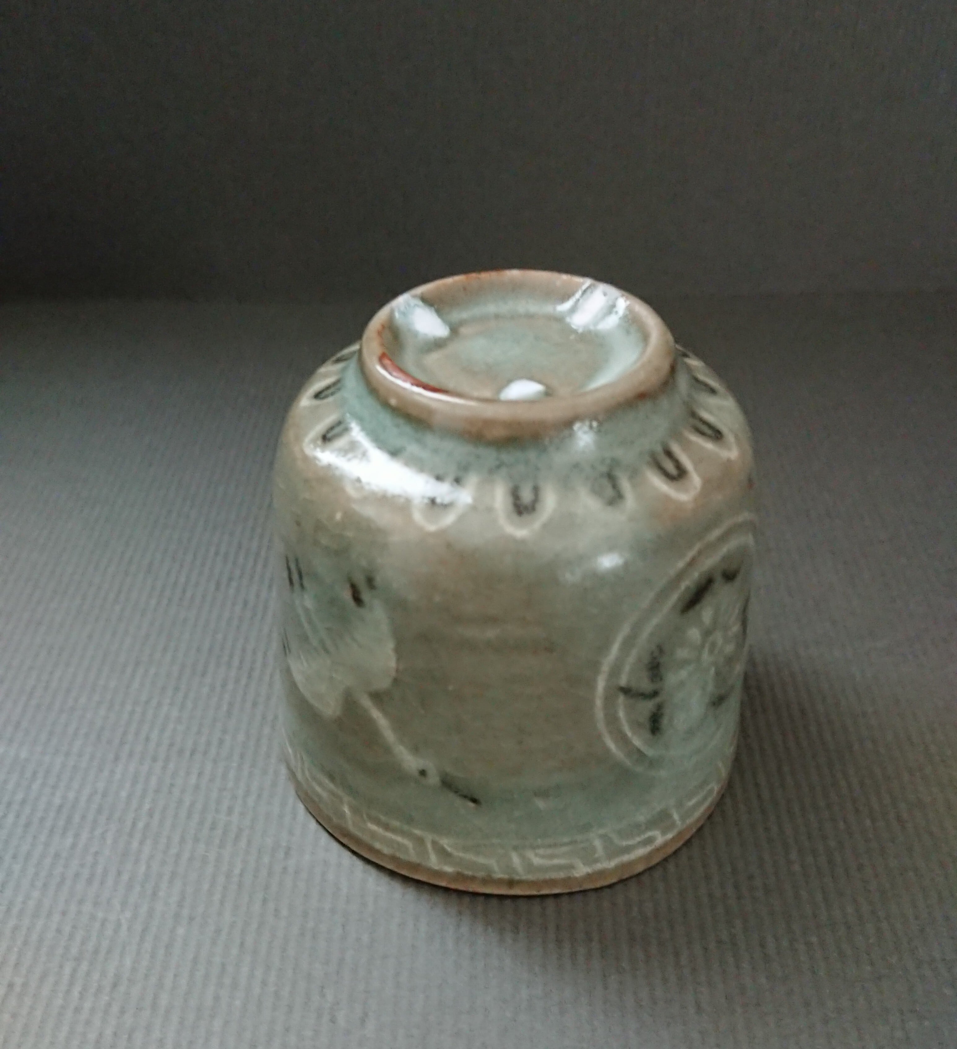 《解説》晩年の利休が愛用した「挽木鞘」をモデルにした作品。高麗青磁の筒茶碗で、胴中程の文様が狂言役者の袴の文様に似ることから一般に狂言袴茶碗と呼ばれる。「挽木鞘」が茶会記に現れるのは利休自刃のわずか三か月前だが、それから死ぬまでの間にかなりの頻度で使用されているところからすると、相当の思い入れがあったと推測できる。堺に蟄居を命じられてからこの茶碗を細川忠興に送ったエピソードはよく知られている。腰の張った筒形は利休がとくに好んだ造形で、長次郎茶碗には当たり前にみられるし、高麗物では他に「三島桶」が好みの茶碗として伝わっている。古松さんは、これを立ちぐい様式にアレンジして、本歌以上に美しく仕上げた。キラキラの青磁でもない、かといって粉青まで濁らない、深く沈静した青は観る者の心にじわりと染み入る。口縁や高台周辺にほのかにさす火色もアクセントになっていていい。利休の魅力を表現するについて、古松さんの作品は欠かせないと身勝手なお願いをしたところ、今回快く御協力頂いた。利休の愛した茶碗の魅力を今によみがえらせてくれているのはもちろん、それだけにとどまらない高麗青磁の稀少な美しさを、この作品は訴えている。